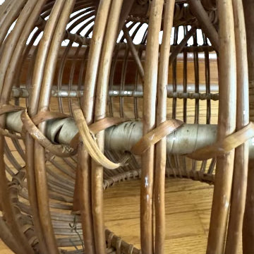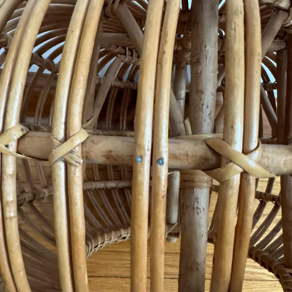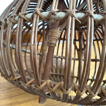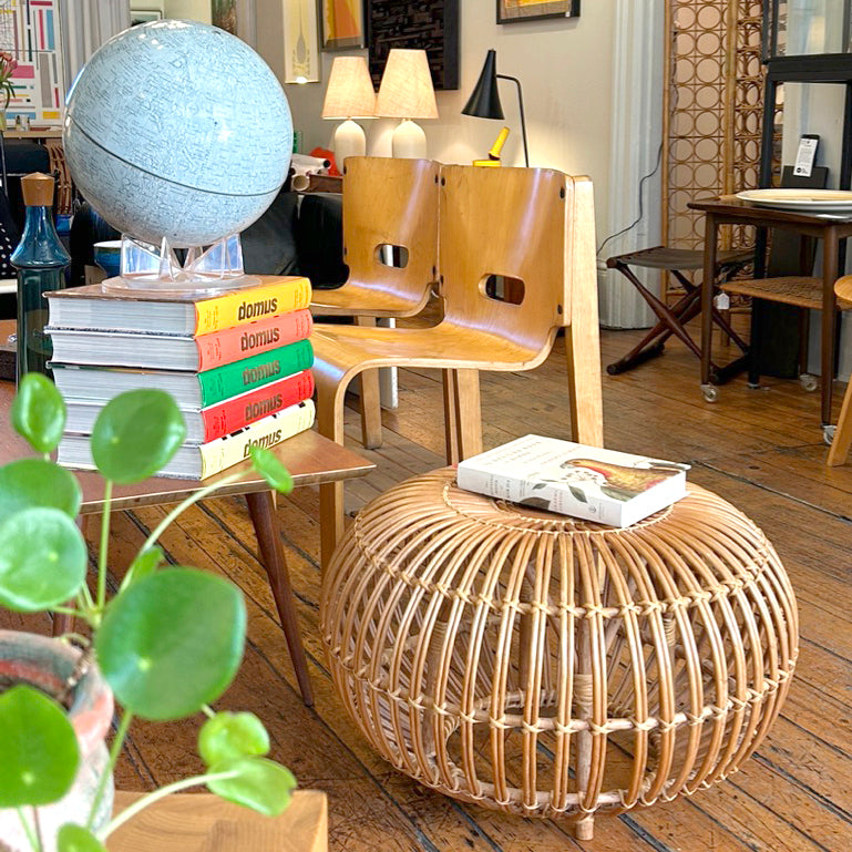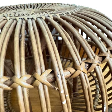 Two original hand woven rattan pouf stools attributed to Franco Albini. Albini had a love for modern forms combined with traditional craft techniques. These are the large versions; Very good original condition; shows some sign of wear. Beautifully sculptural handmade pieces. Italy, 1950s.