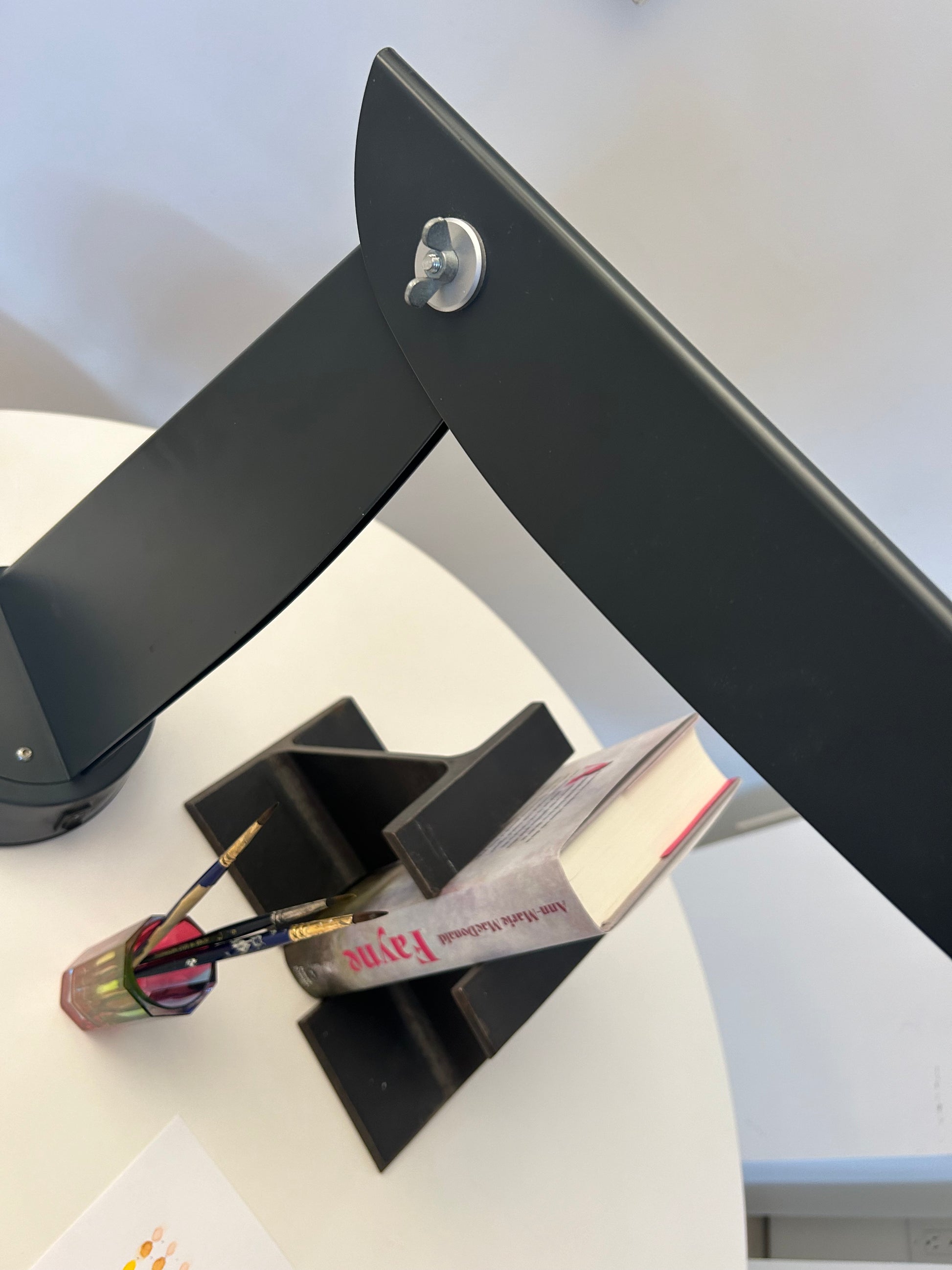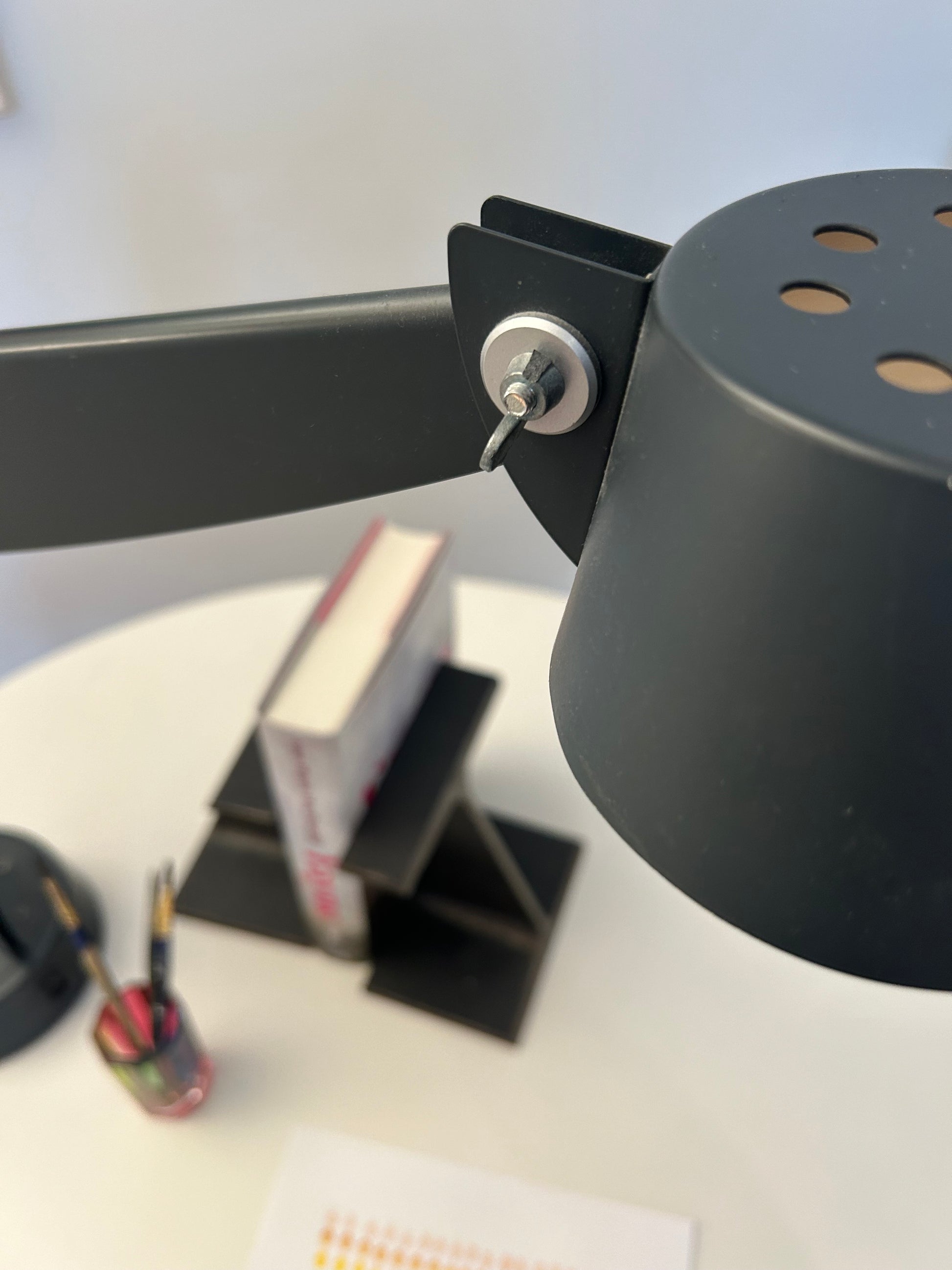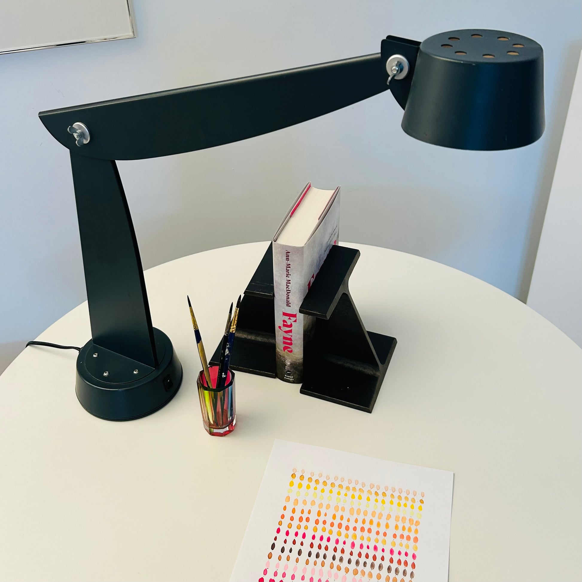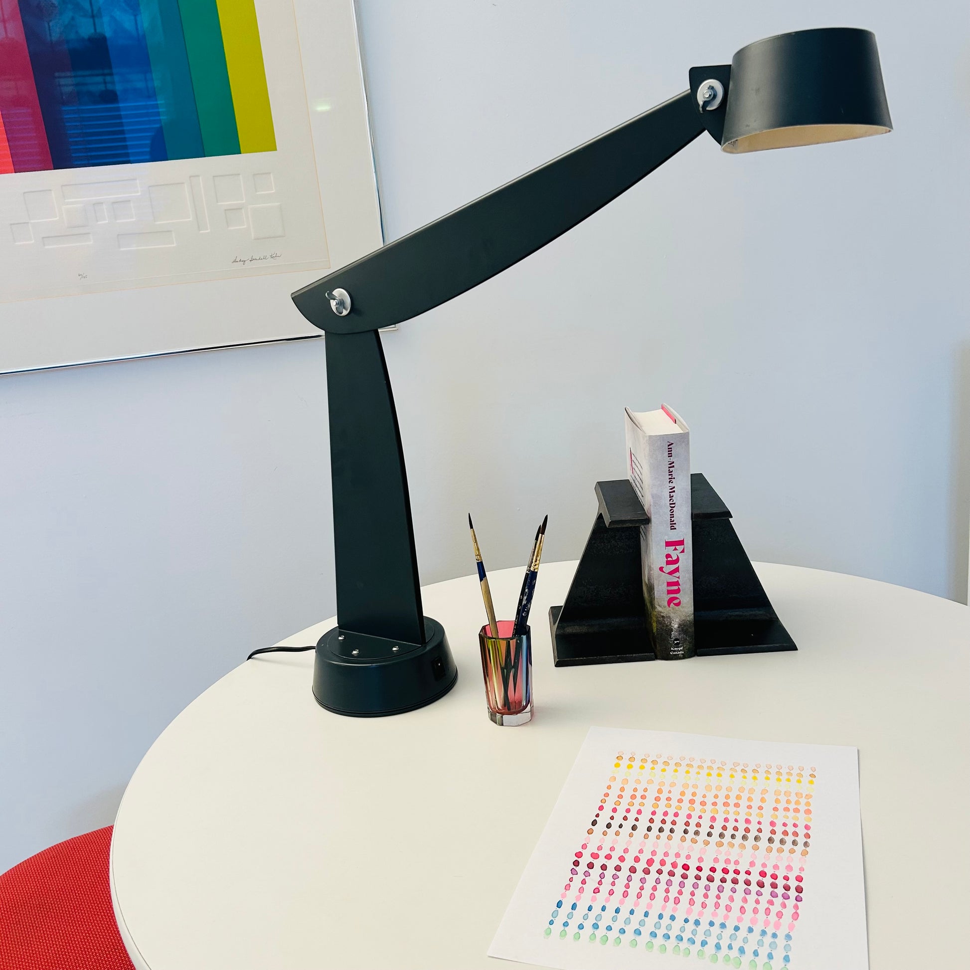 RARE. Like a bird! Terence Conran for Habitat UK/France, 1990s. Great for studio, office, home. Fully adjustable powder-coated charcoal grey steel, classic wing nut joins. 35” max height, 24” max width, 7” base. Wired for NA. ON SALE. WAS $525.