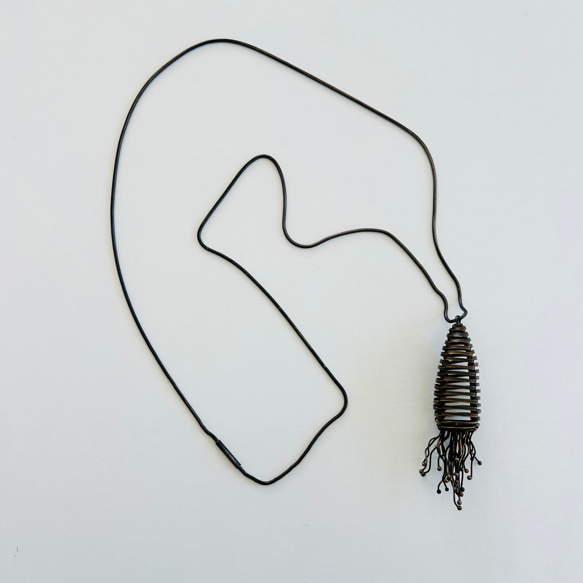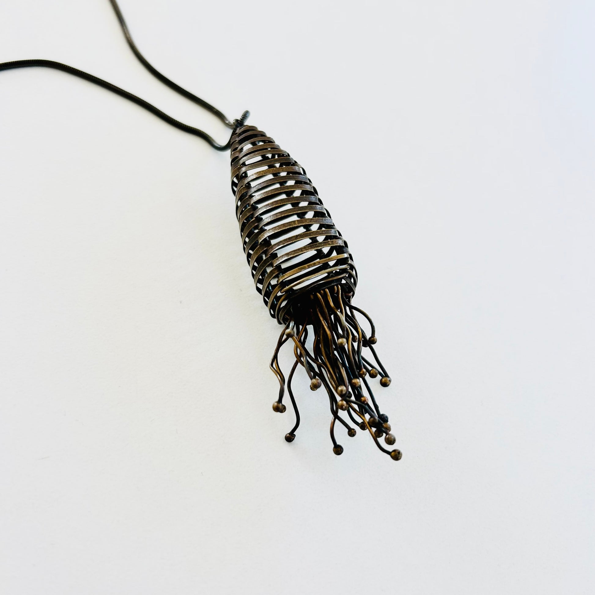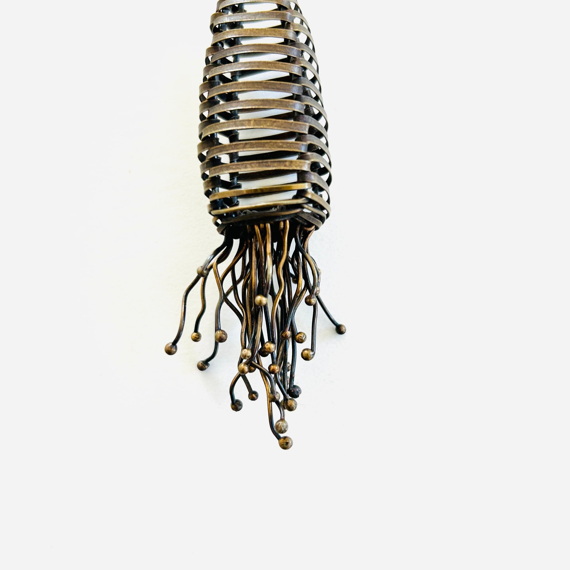 Incredibly intricate hand made necklace by Biba Schutz. Bronze wrapped on sterling silver. 44" snake chain, pendant 3.5 x 1 x 1 in. In excellent condition.