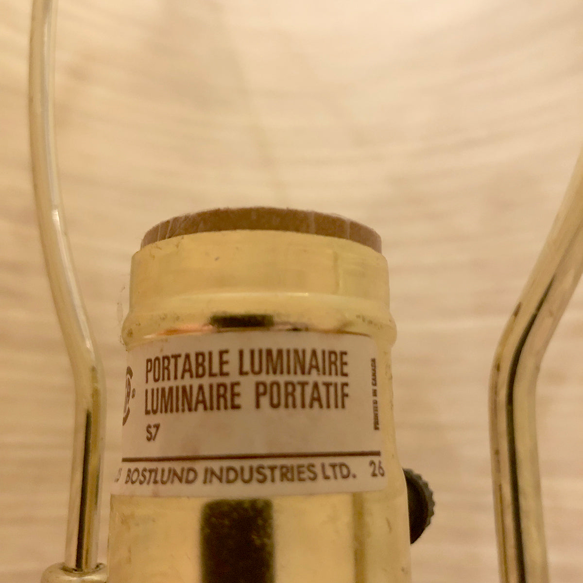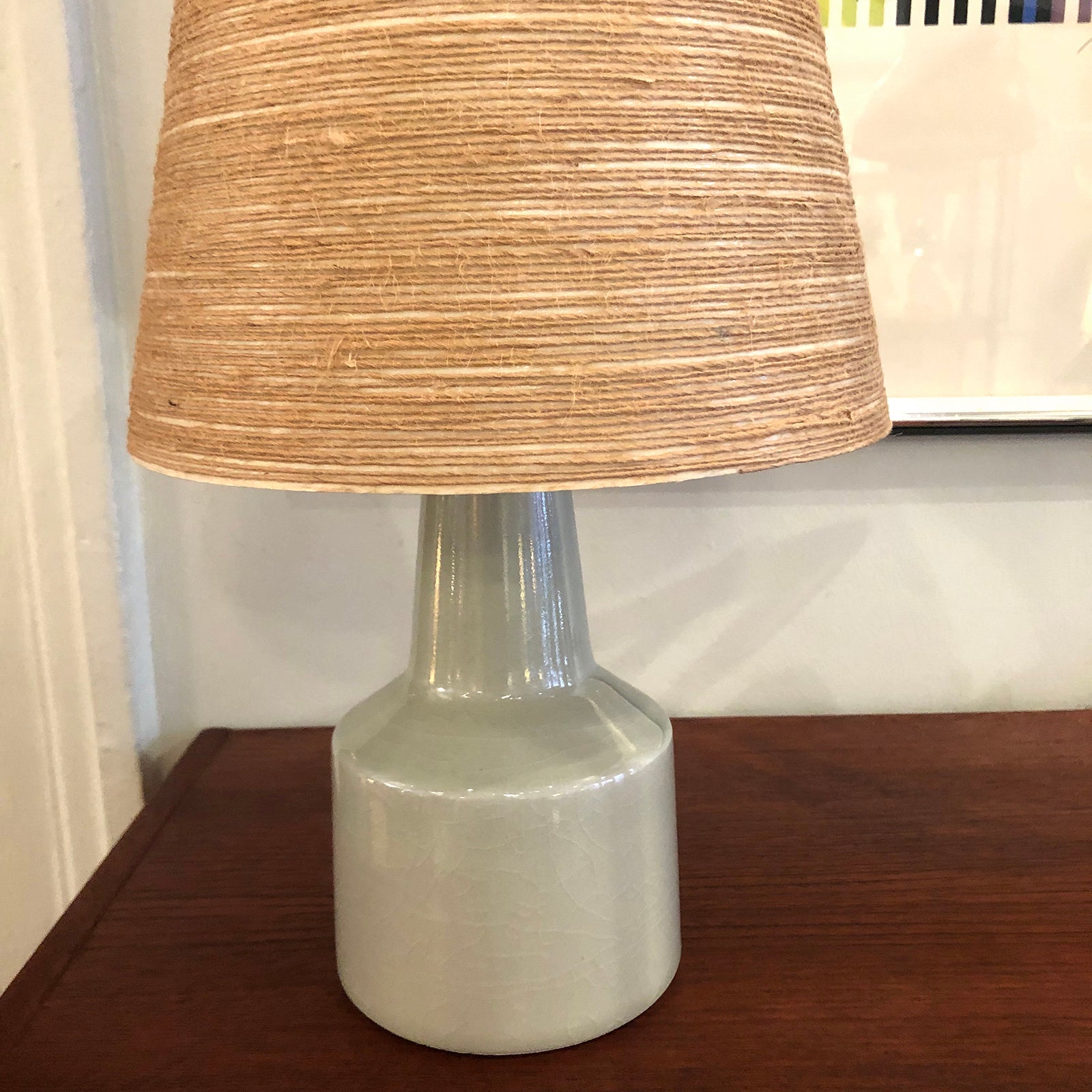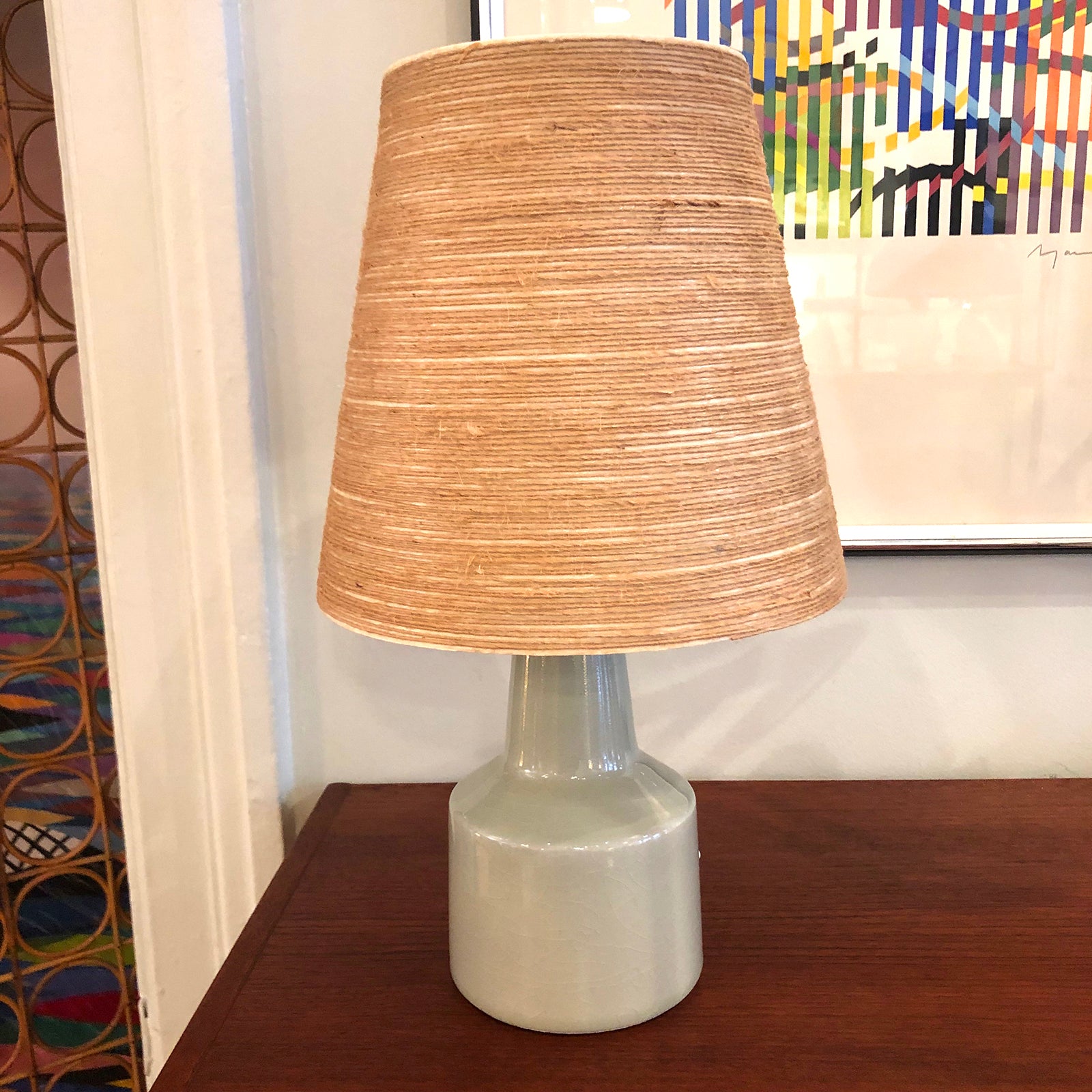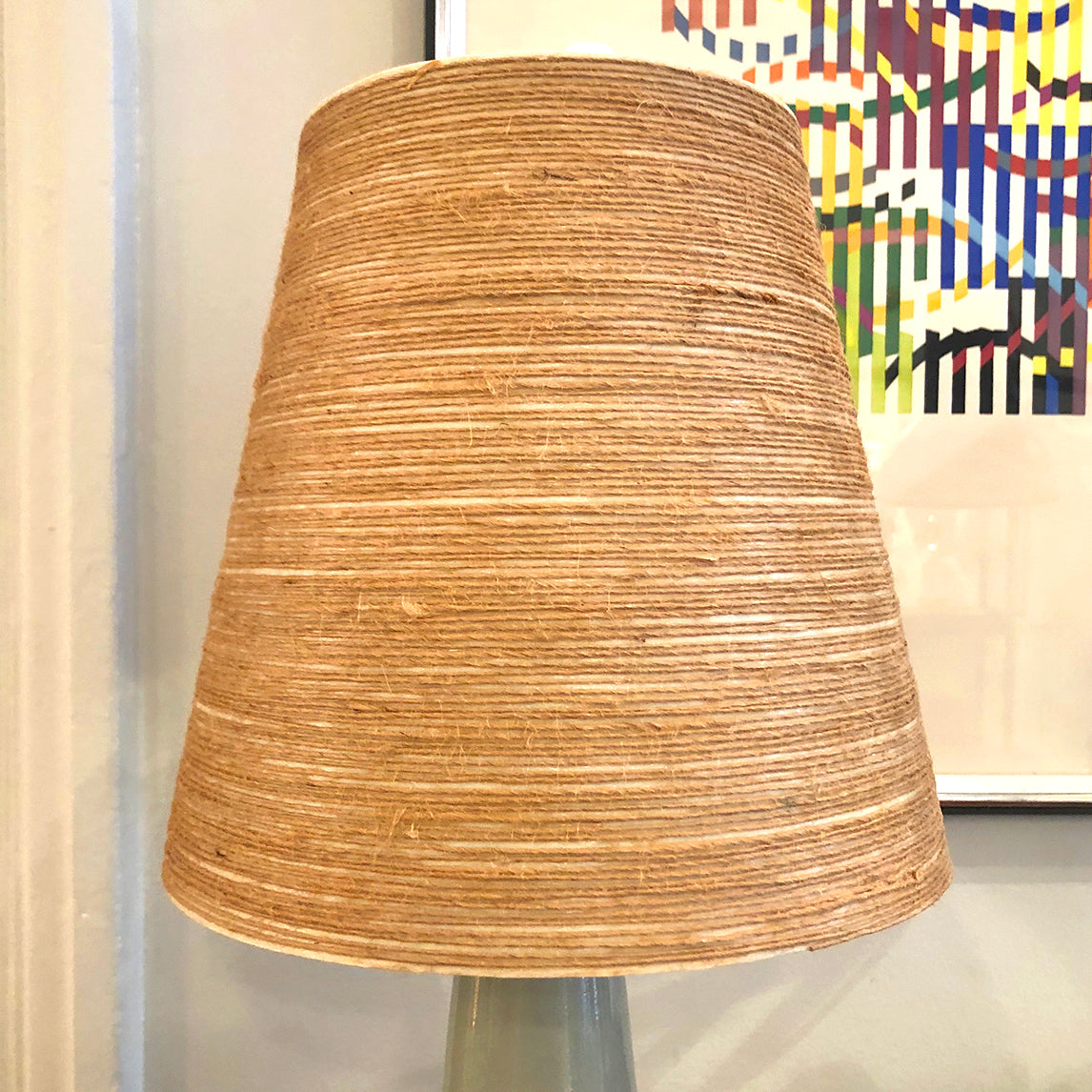 Ceramic base and spun fiberglas and hemp shade. Tri-switch. Mint condition. 16" tall. Made in Canada, 1970s. 3 available.