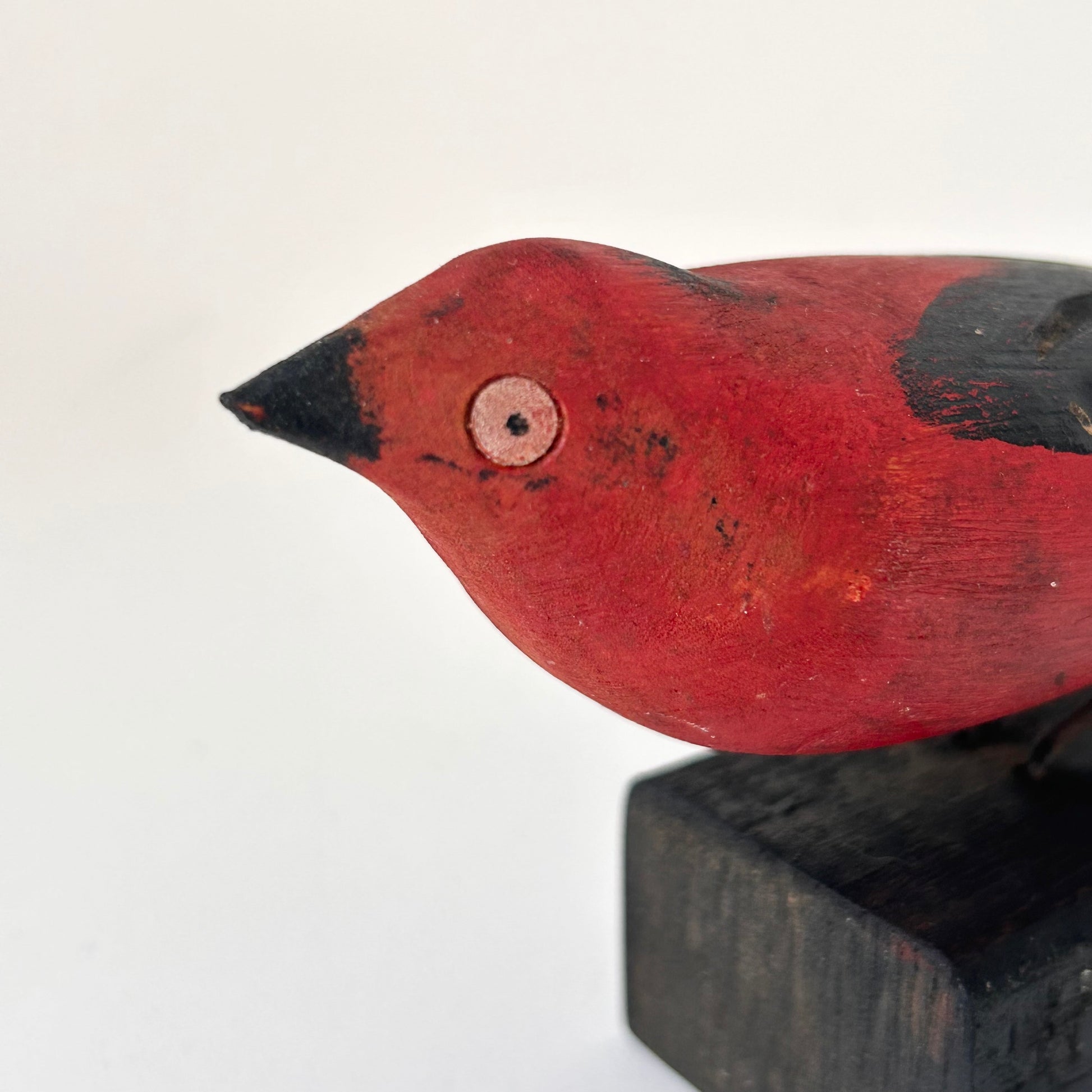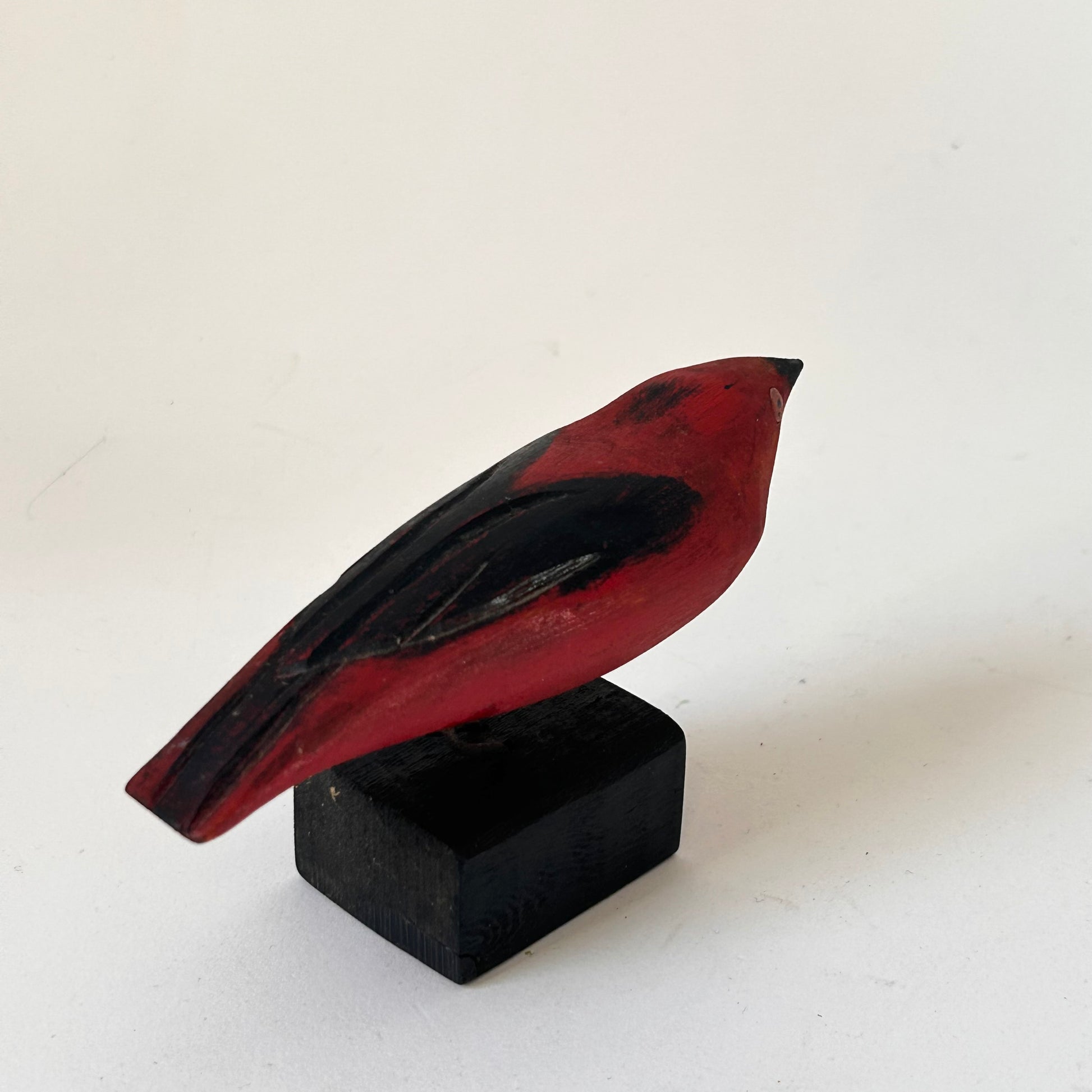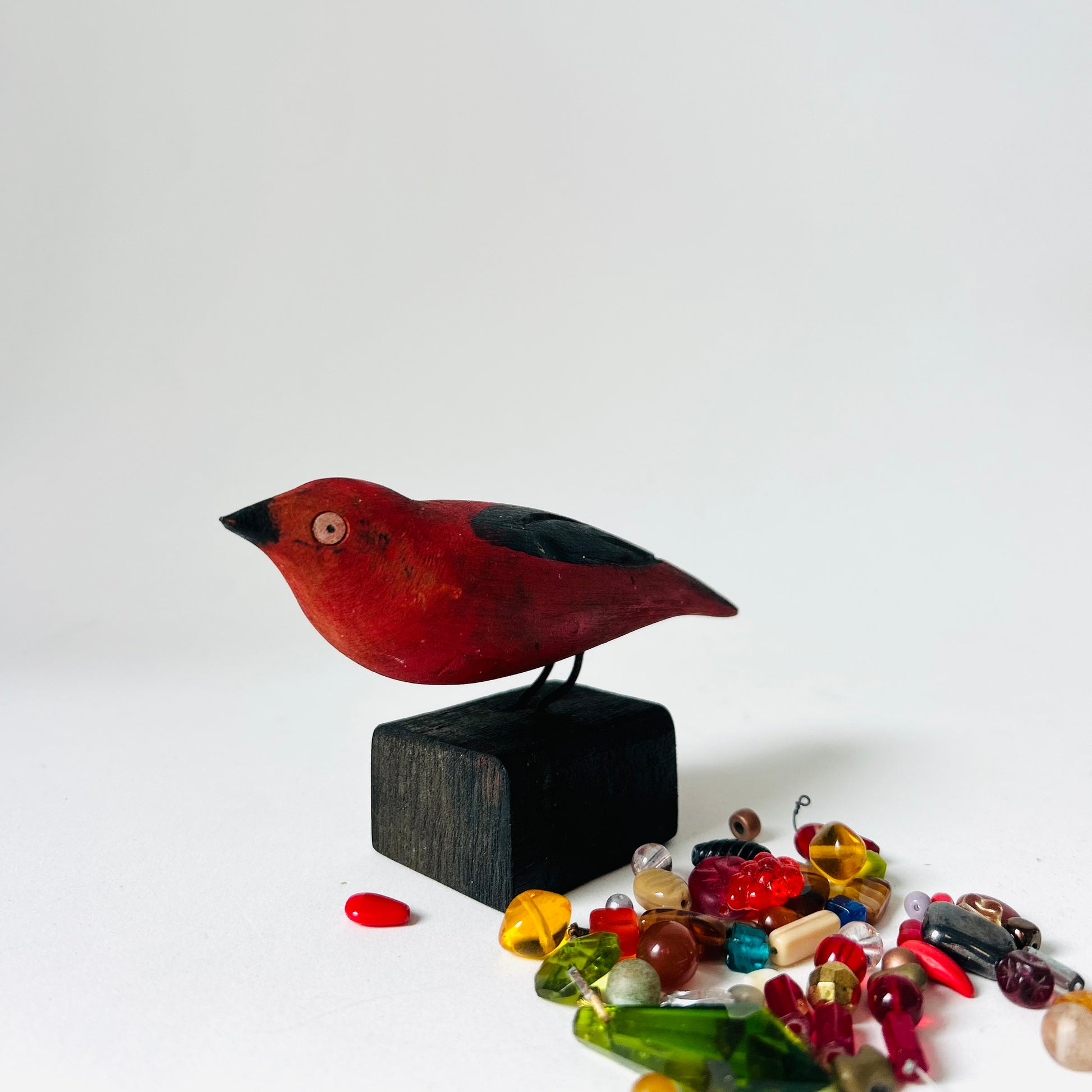 PENDING. Beautiful Scarlet Tanager by Quebec Folk Artist Claude Lamontagne (1939 to 2004). Painted pine, 3.25”h. Signed.