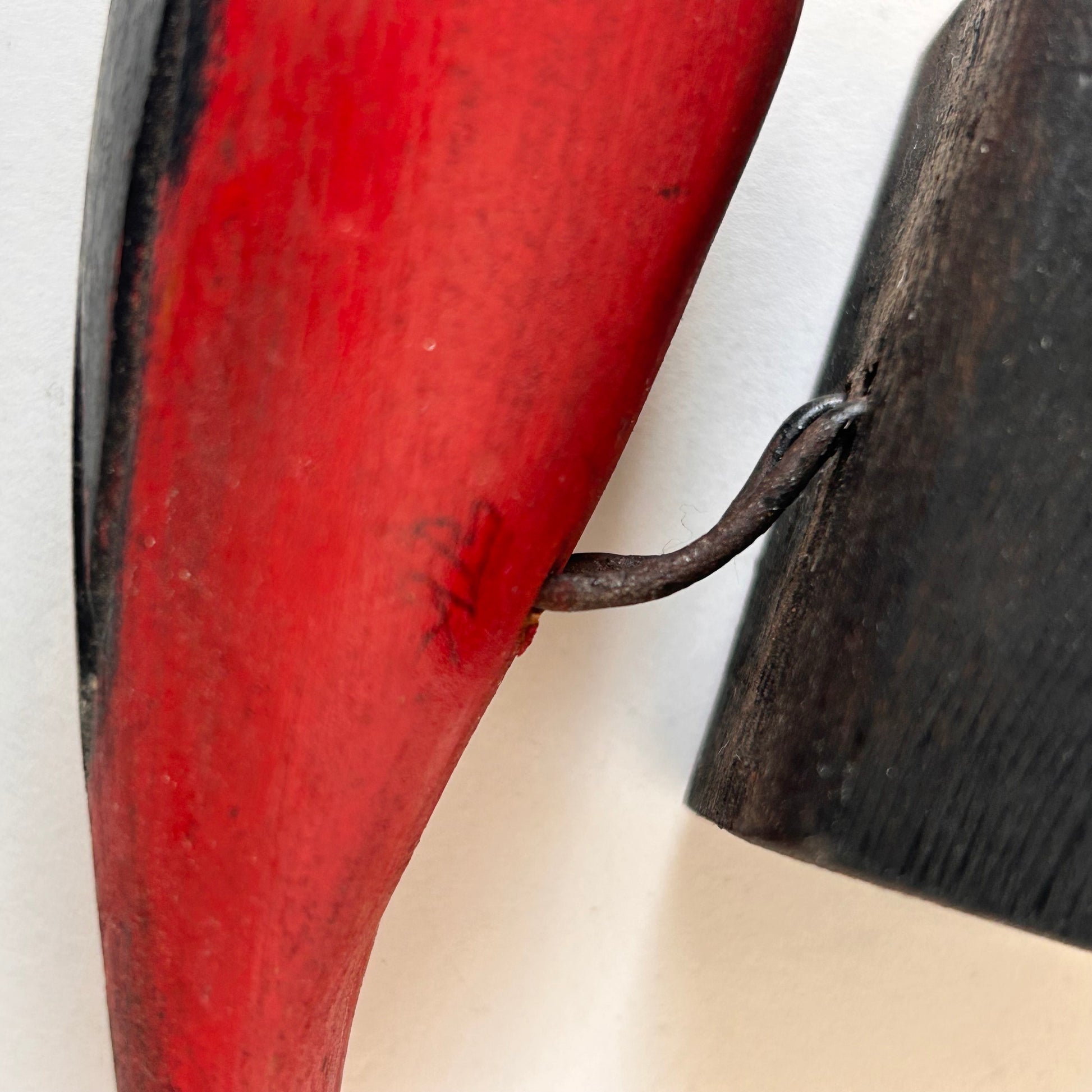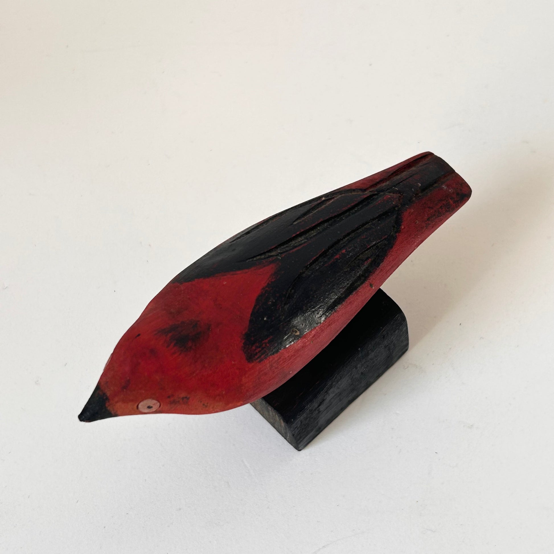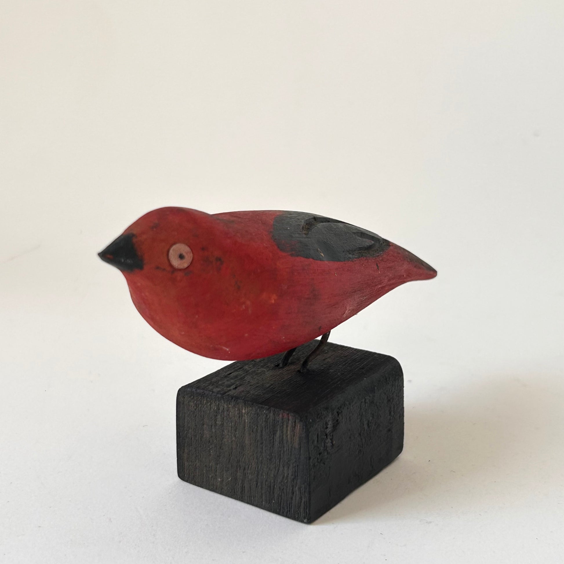 PENDING. Beautiful Scarlet Tanager by Quebec Folk Artist Claude Lamontagne (1939 to 2004). Painted pine, 3.25”h. Signed.