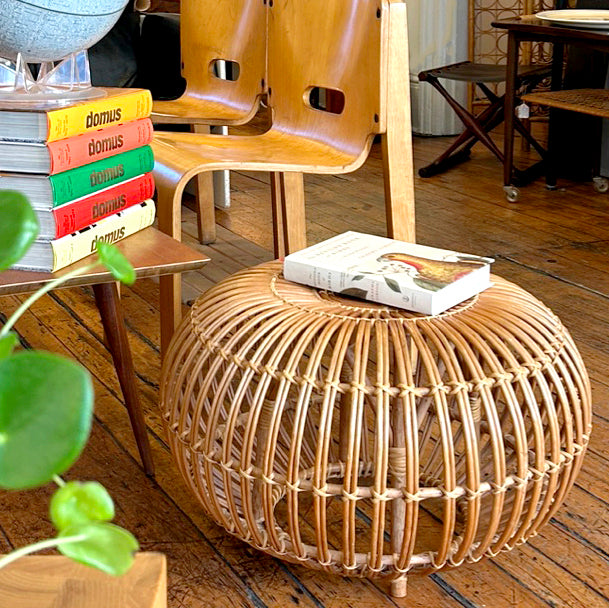 Original hand woven rattan pouf / stool attributed to Franco Albini. Albini had a love for modern forms combined with traditional craft techniques. These are the large versions; Very good original condition; shows some sign of wear. Beautifully sculptural handmade pieces. In great vintage condition with the exception of one break (photo 3) which doesn't effect the structure in any way. A very solid piece. Italy, 1950s.