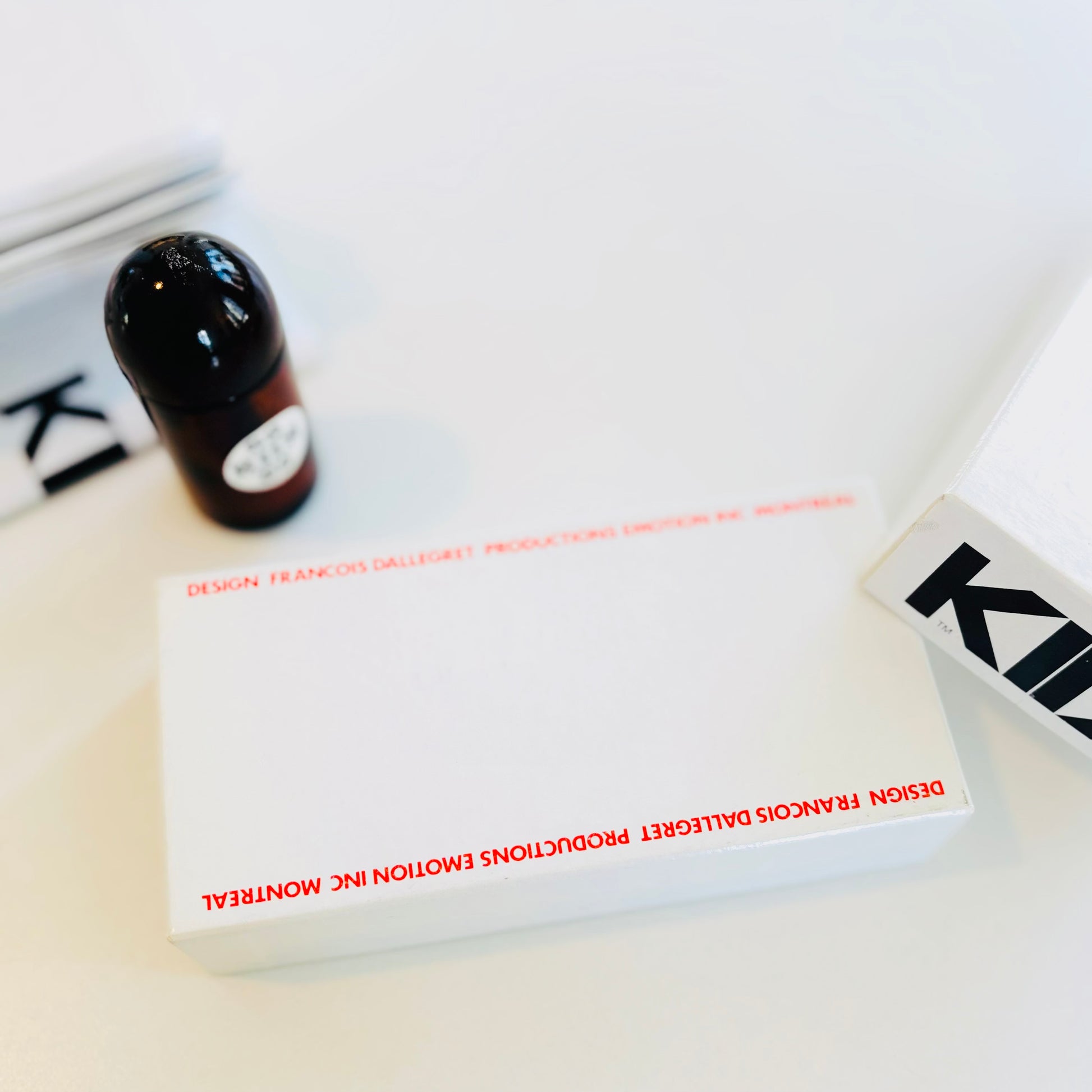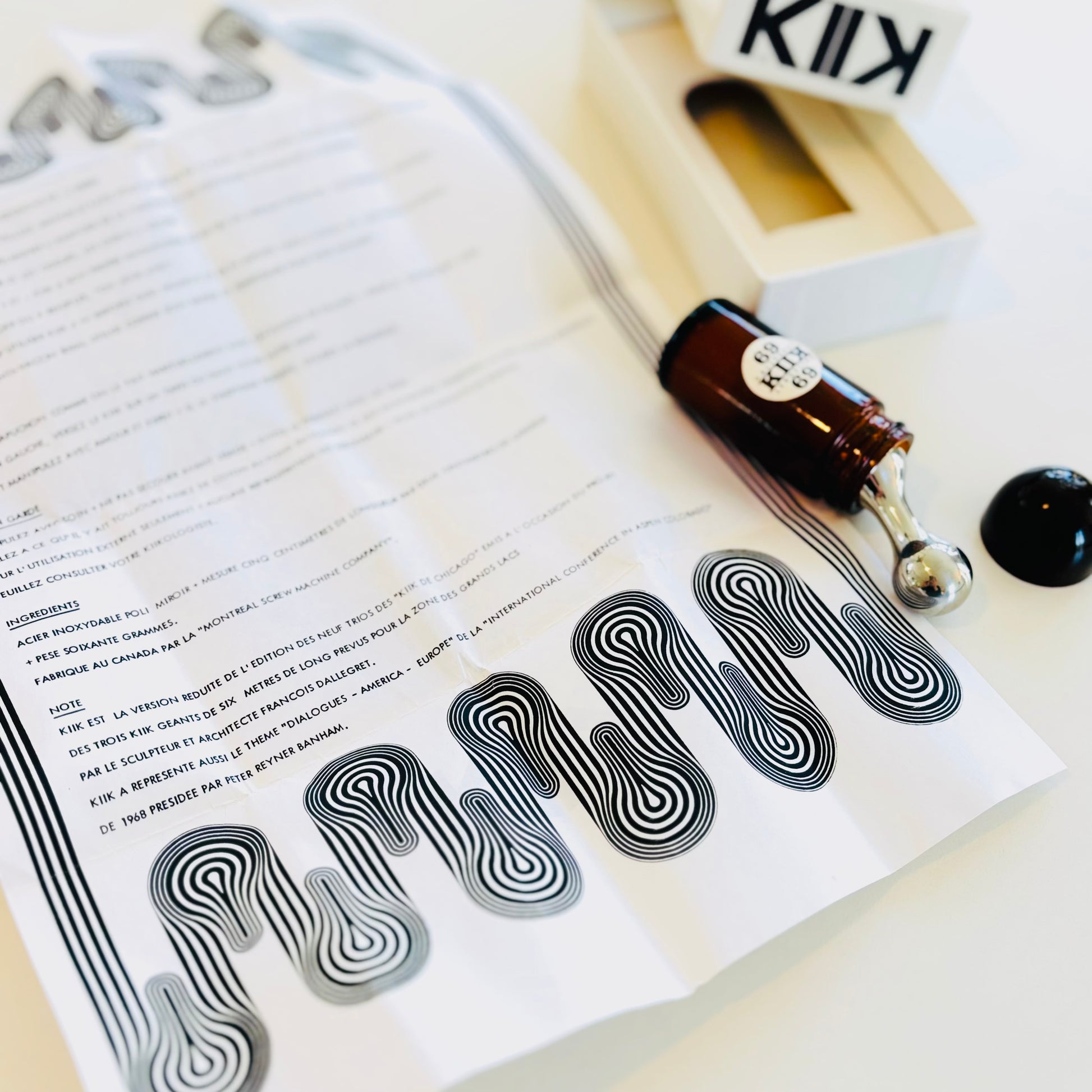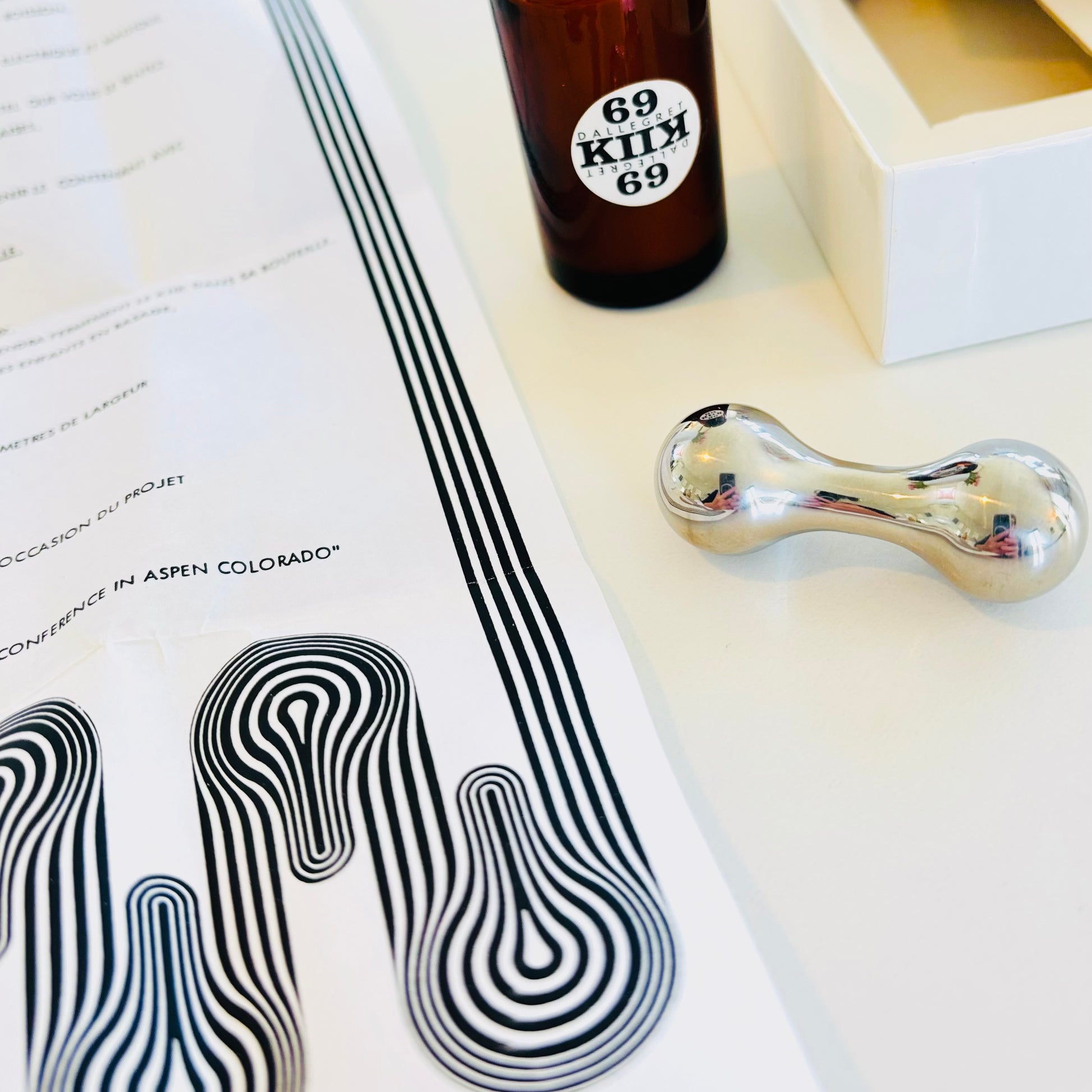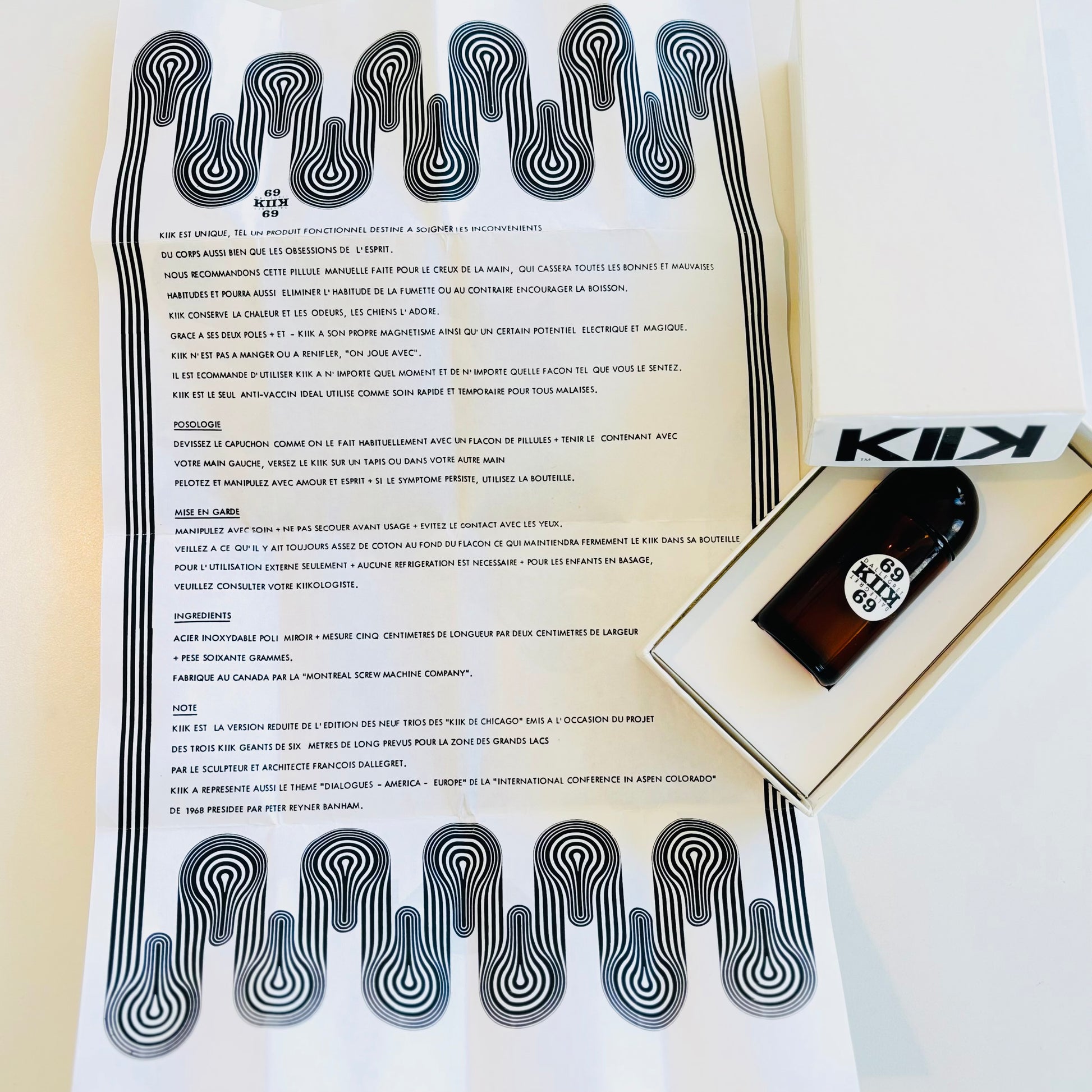 A Rare Kiik 69 Object by Morocco-born Canadian artist François Dallegret. The stainless steel barbell-shaped objet comes with its amber glass case, original box, sticker, and pamphlet.