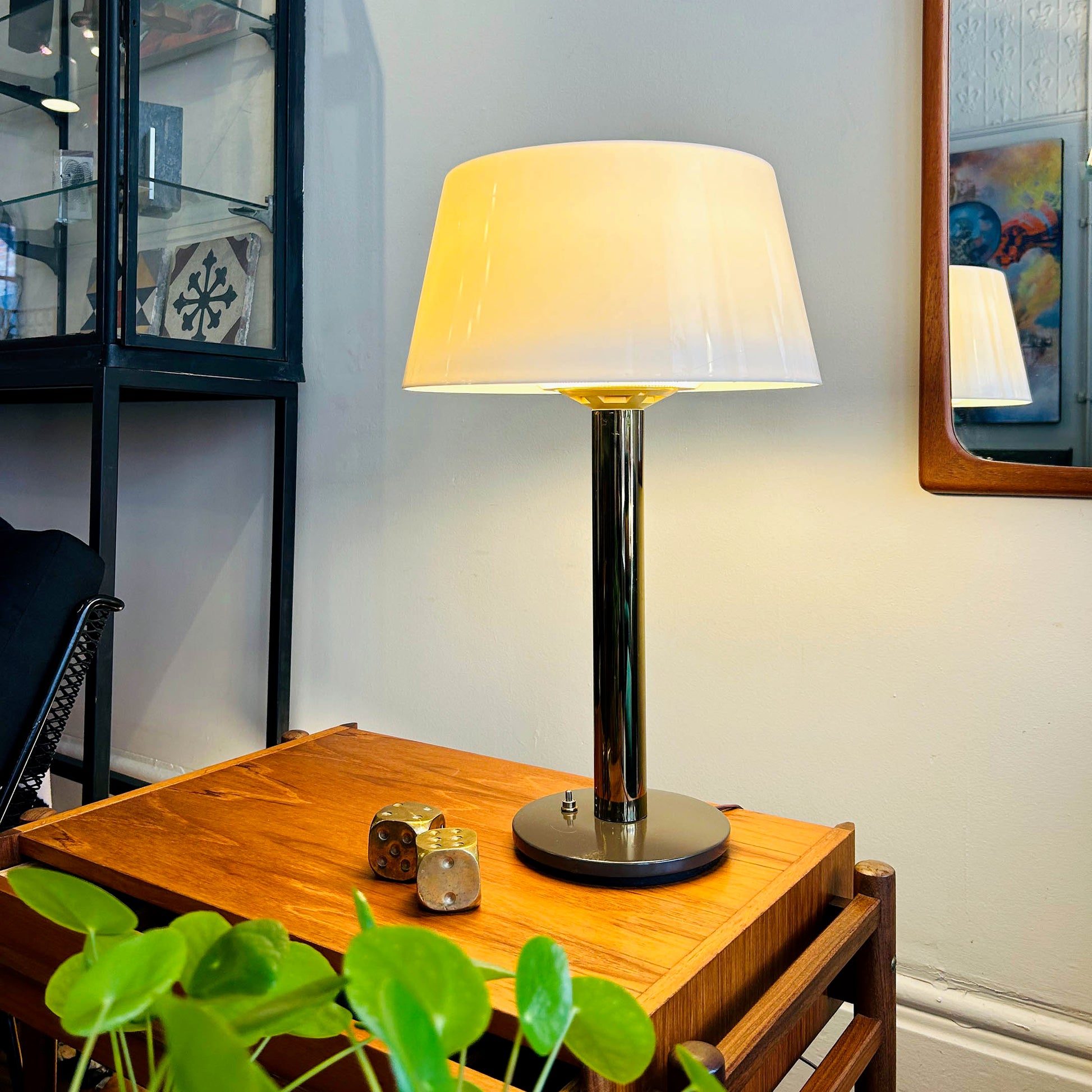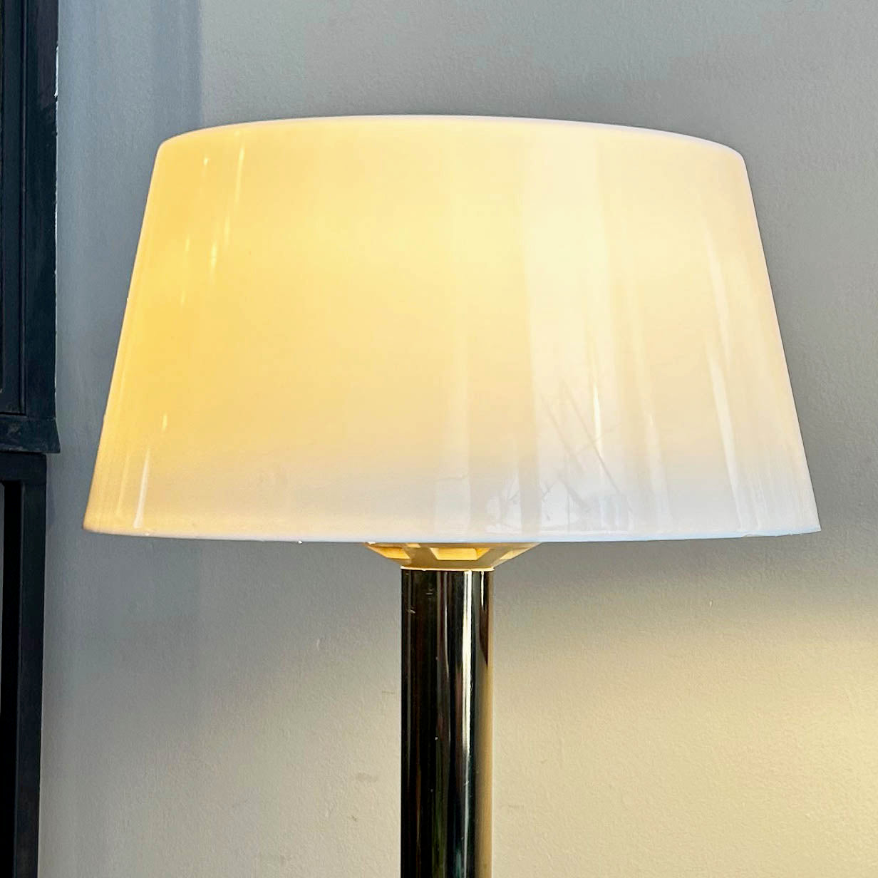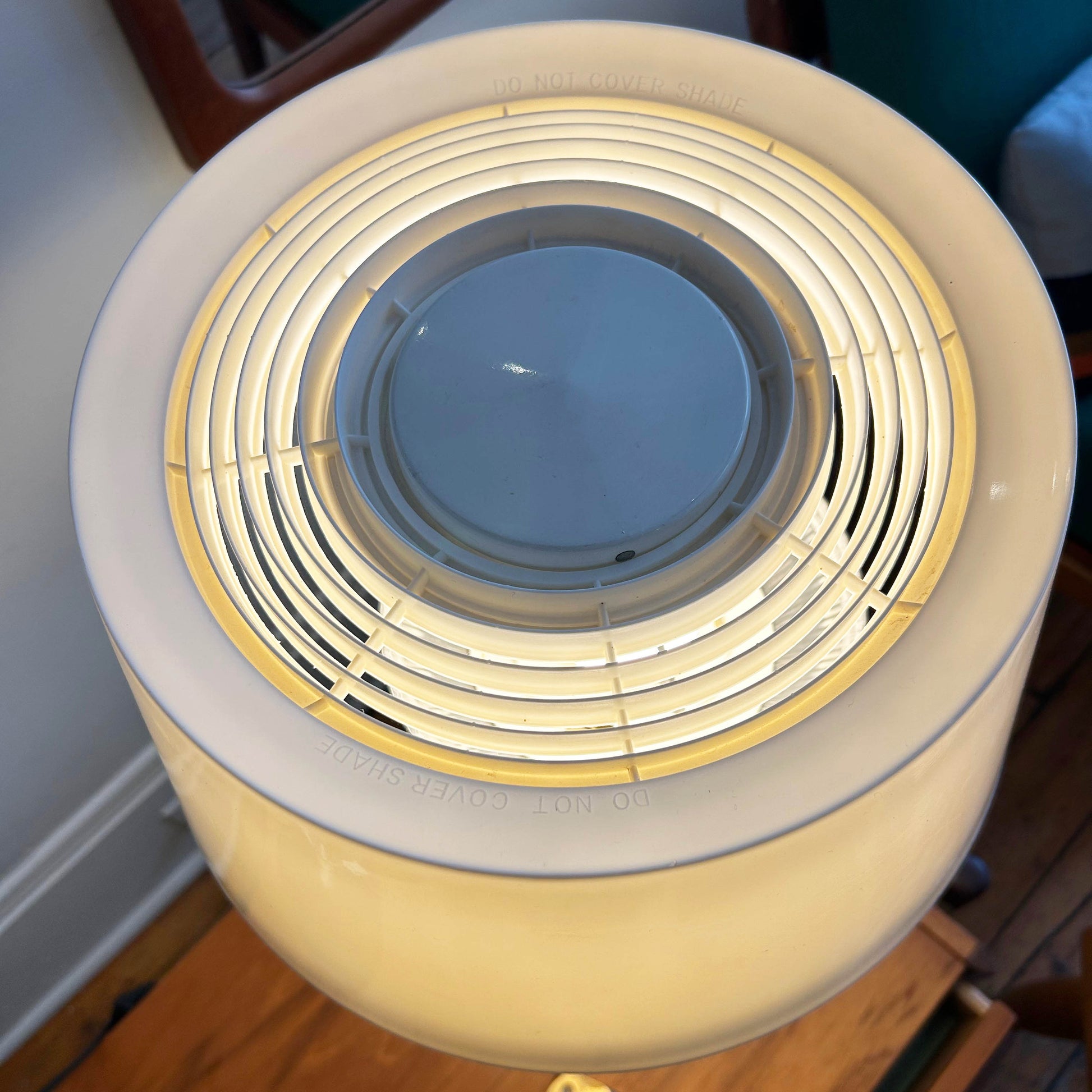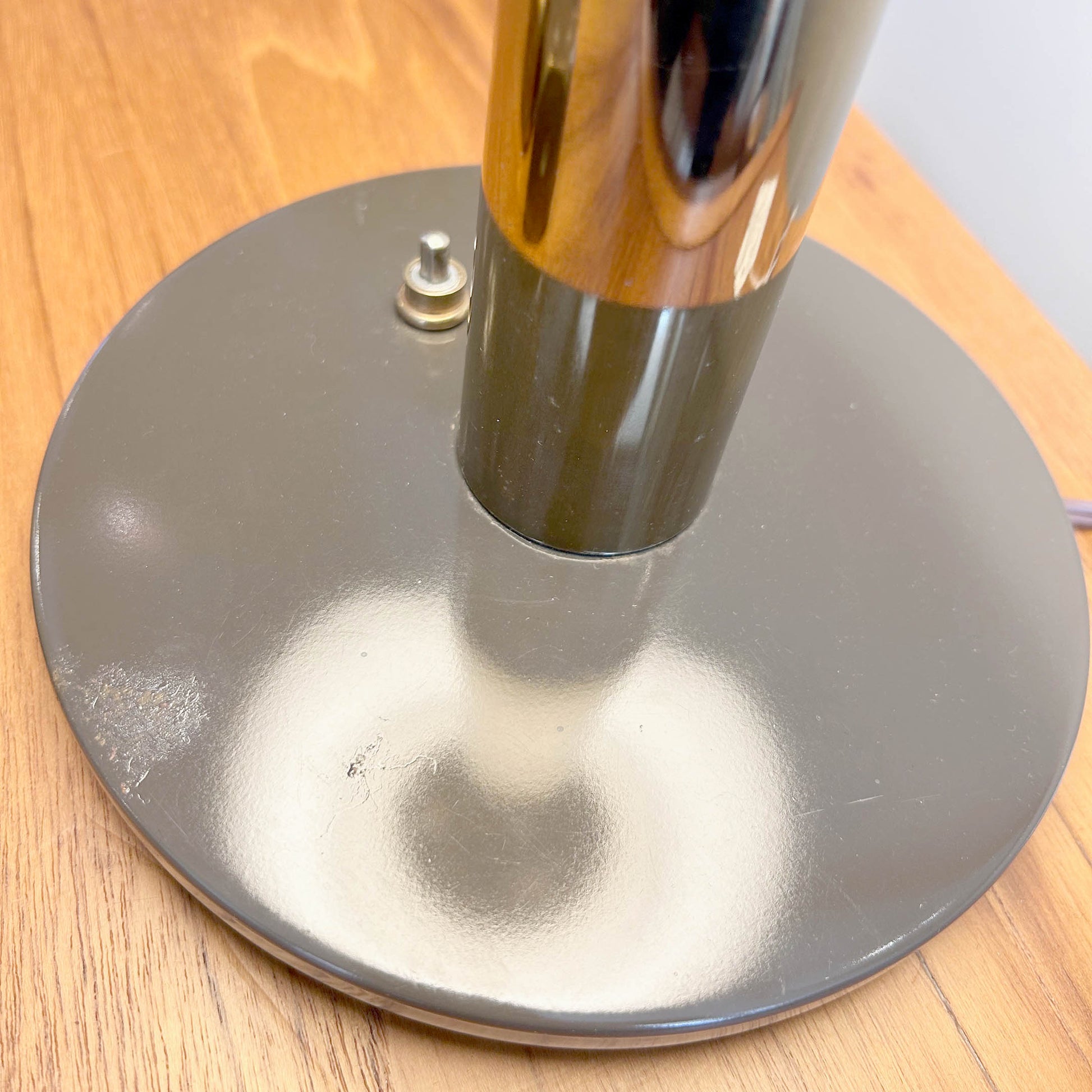 Designed for Lightolier. Charcoal grey base, brass stem and white plastic drum shade with diffuser. One mark on base (as shown) otherwise in great original condition. 13.75ʺw × 13.75ʺd × 22ʺh. USA, 1960s.