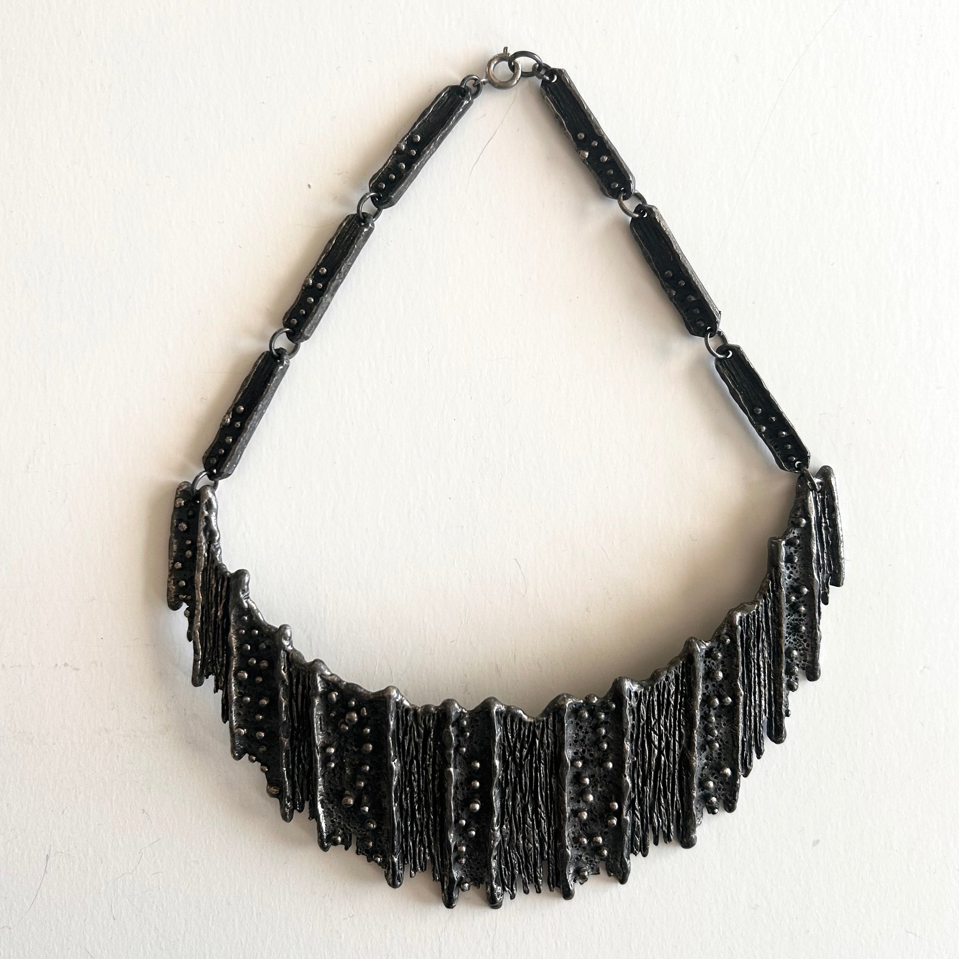Guy Vidal brutalist necklace. Plated pewter. 5.5" x 2" x 14.5" length, excellent condition. Signed on reverse. 1970s, Canada.