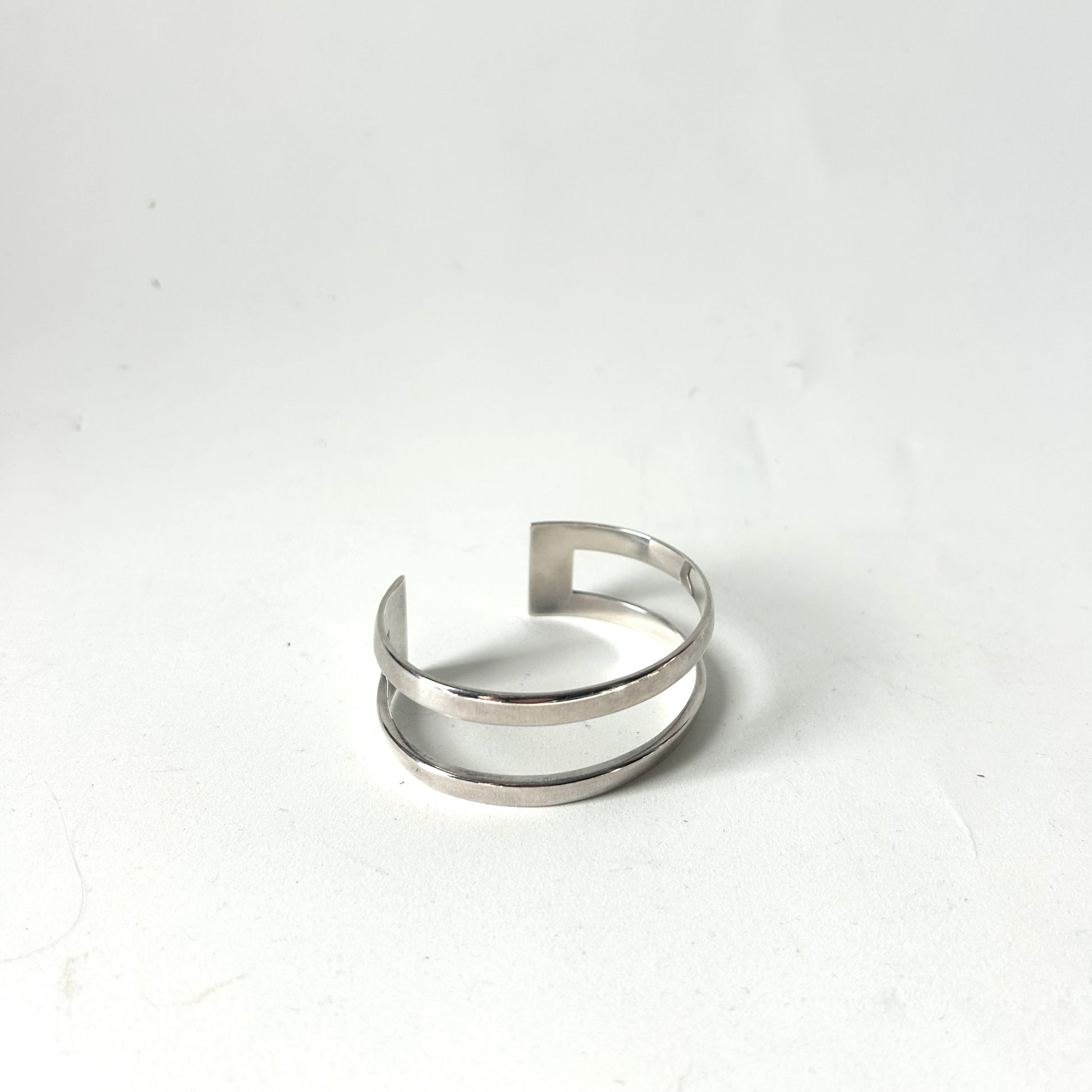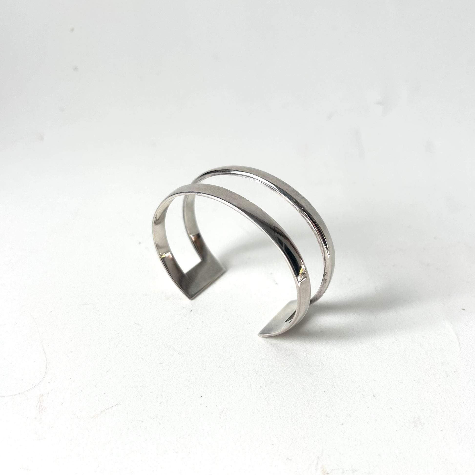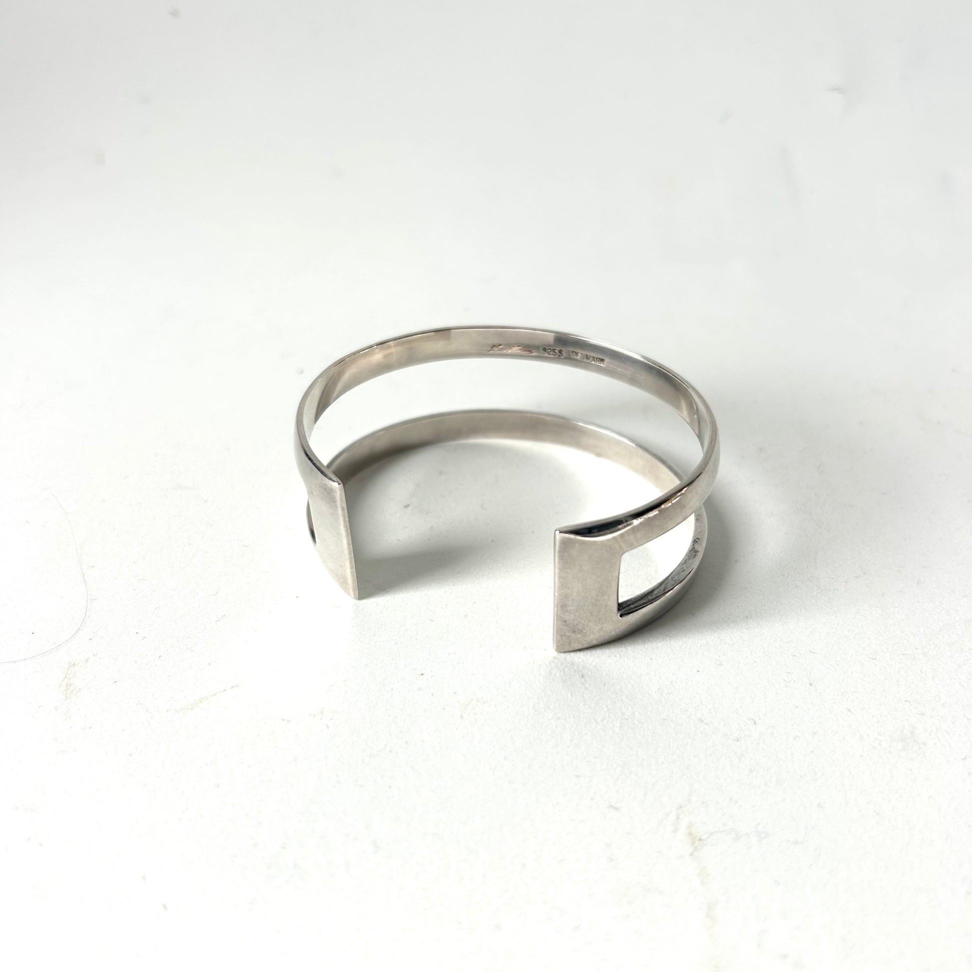 Beautiful Modernist sterling cuff by Hans Hansen. Signed Hans Hansen, Marked 925S Denmark. 6.5” dia. cuff with 1.25” opening- 7.75” wearable diameter. 1” wide.