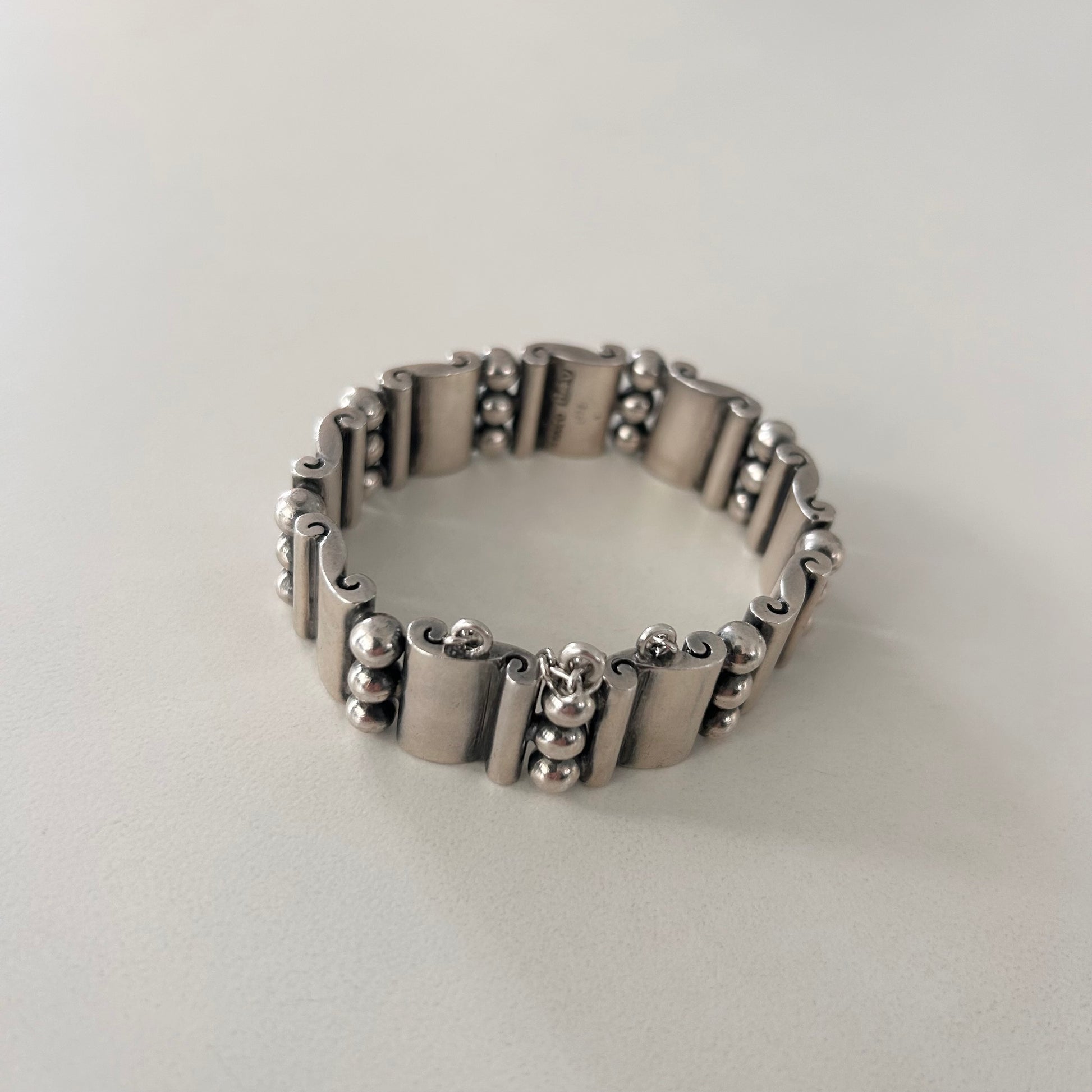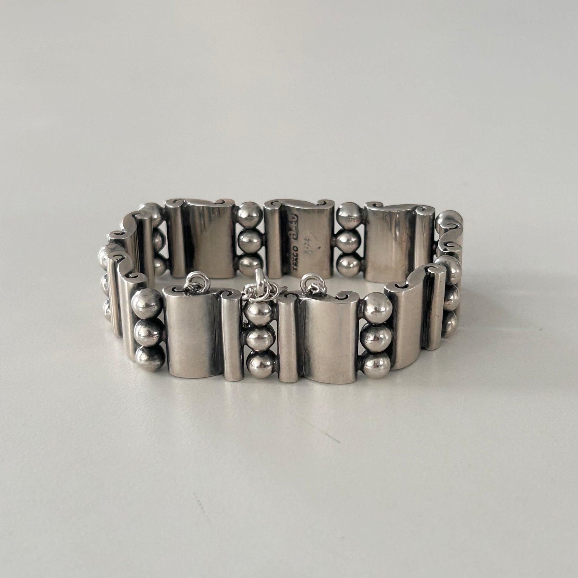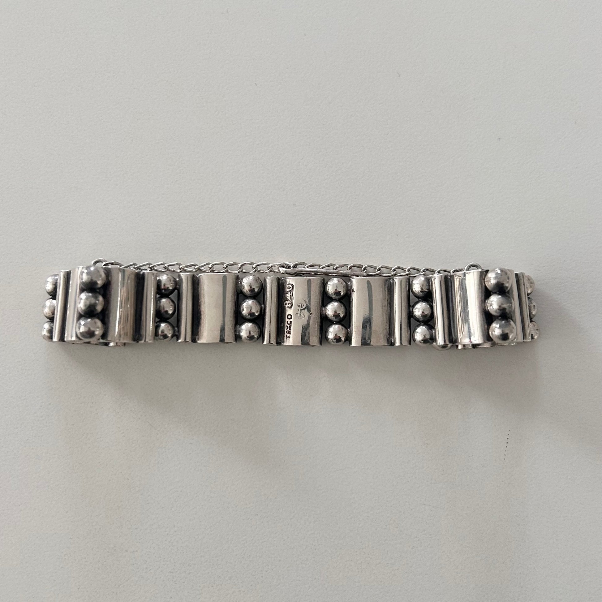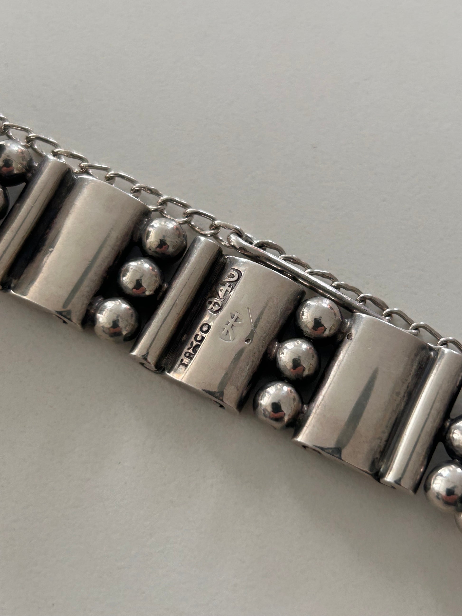 Hector Aguilar solid sterling silver ball and panel bracelet with pin and chain clasp. Inspired by Aztec and Mextex art. Marked 940 Taxco. Excellent condition.