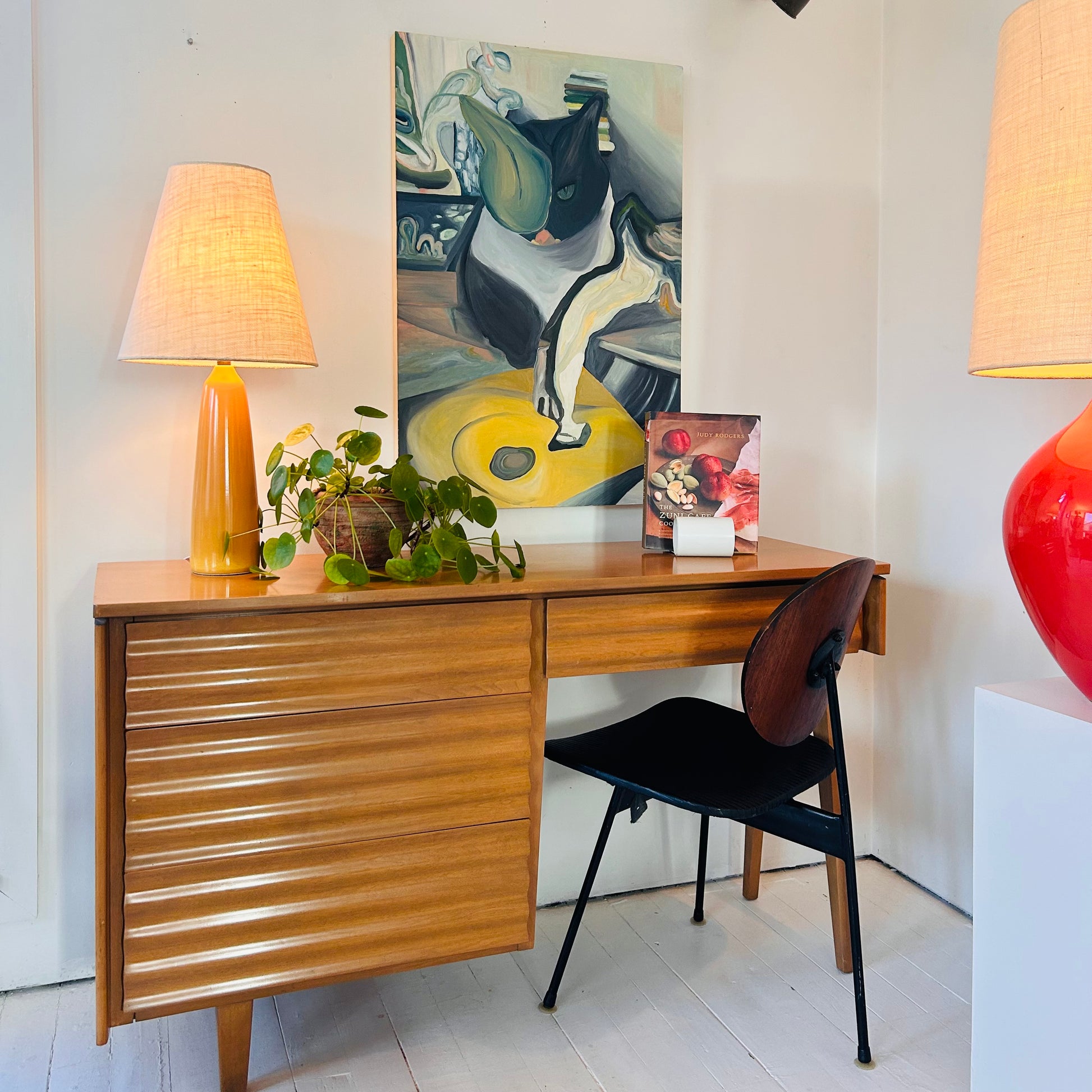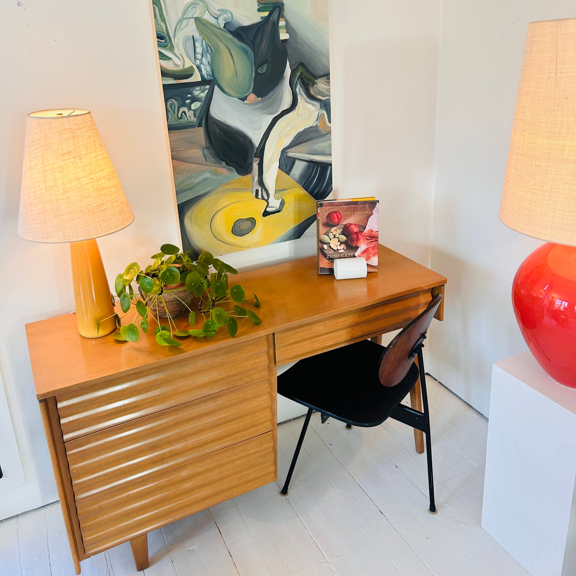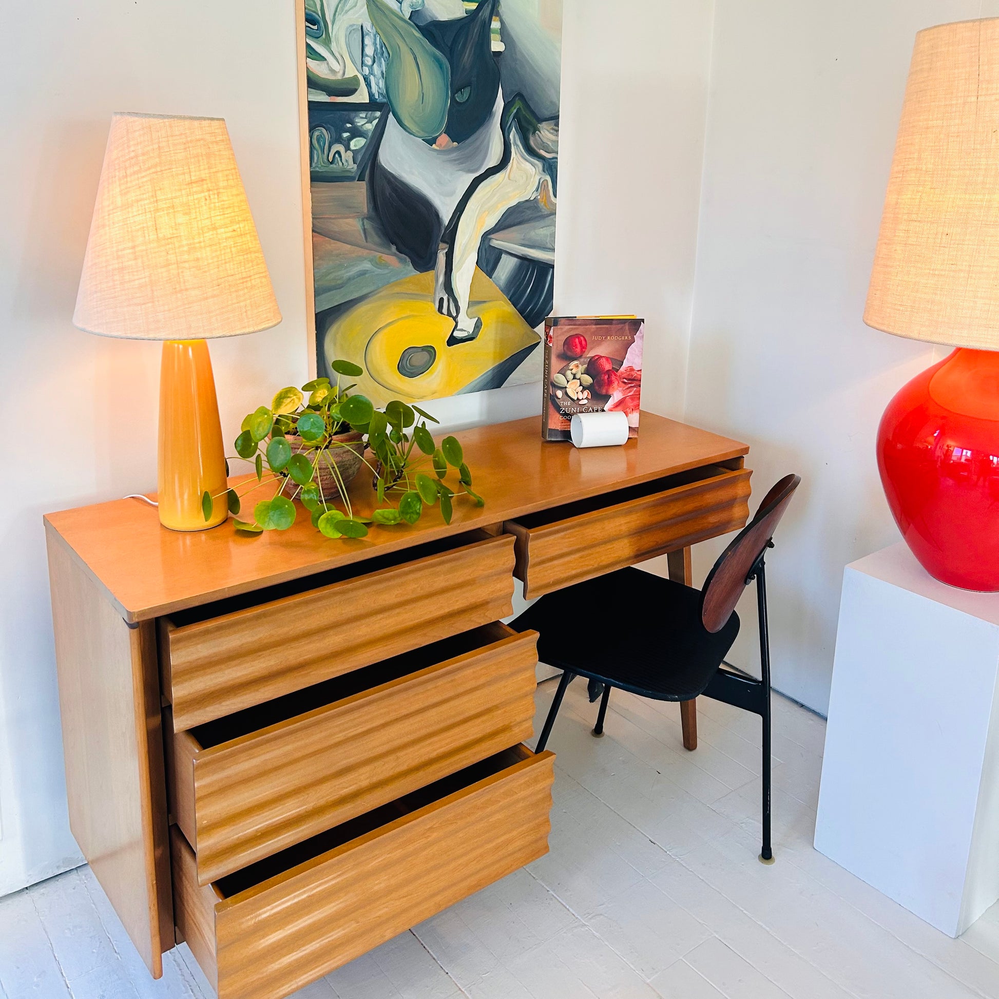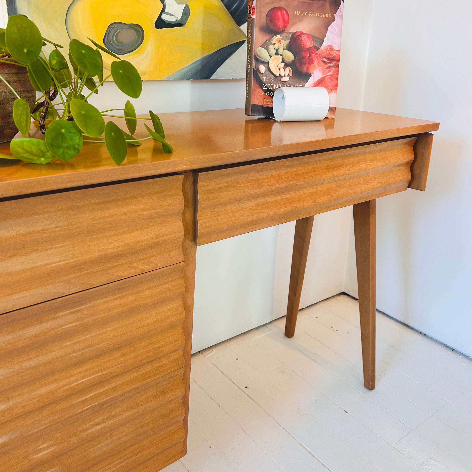 Rare Canadian Design. Jan Kuypers (1925–1997), Helsinki vanity/ Stavanger wave front desk, 1952 for Imperial Furniture Manufacturing Co., Stratford, ON. Yellow birch, 30.5h 16.75d x 32l in. Mint condition, all original.