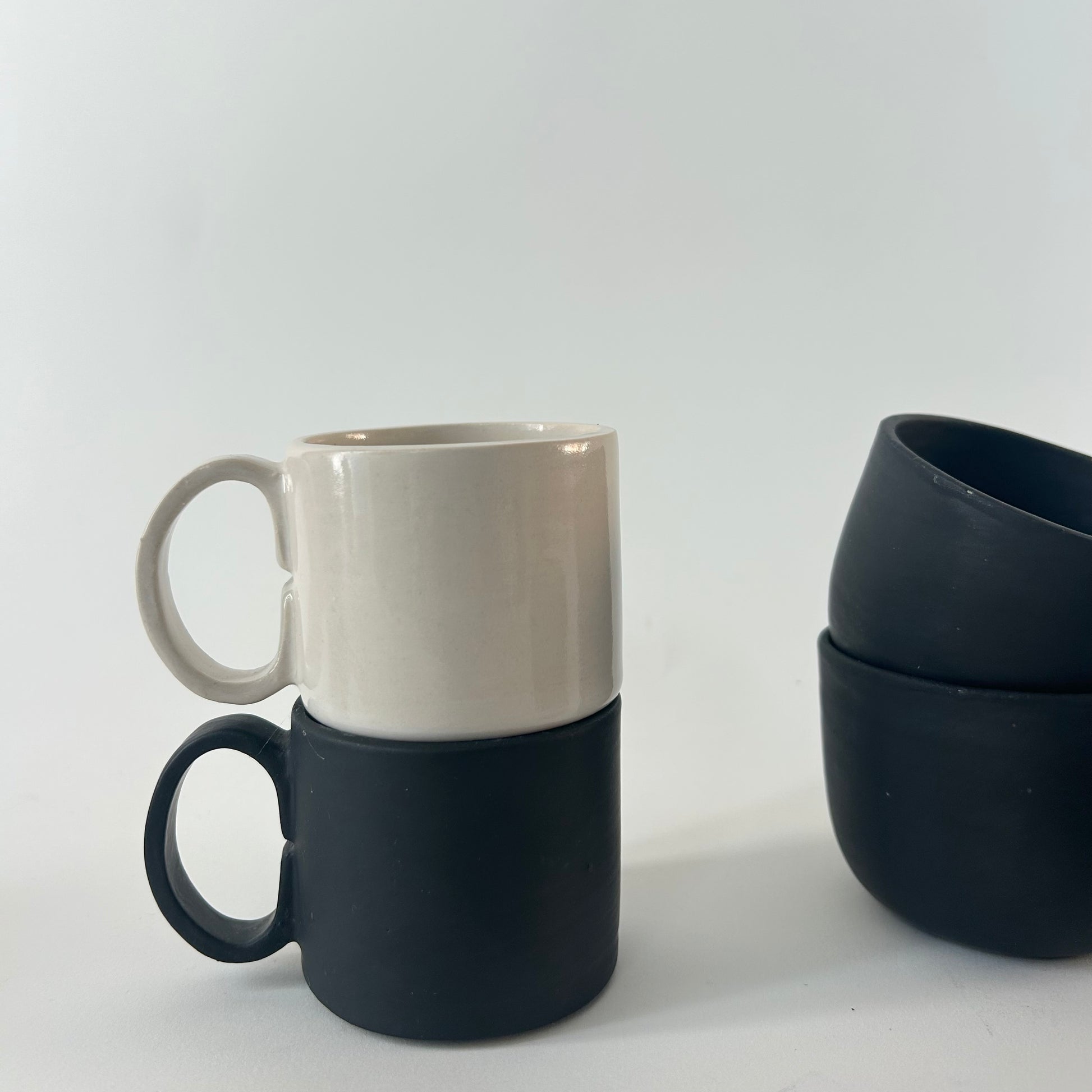 Gorgeous matte black and bone glaze ceramic cups & mugs by LJM Ceramics. 2.25” h. Signed. Sold as a set of 6.