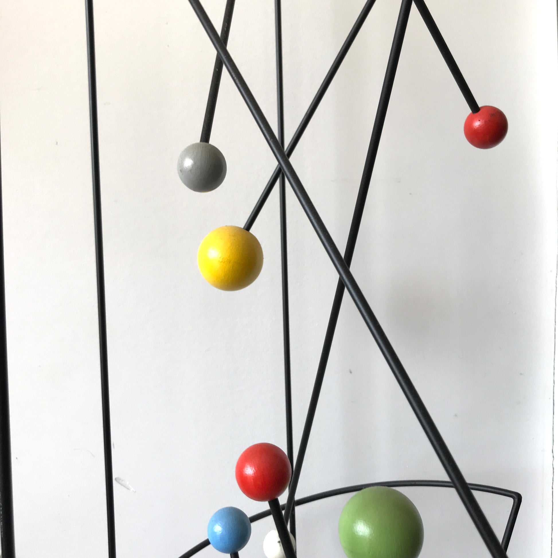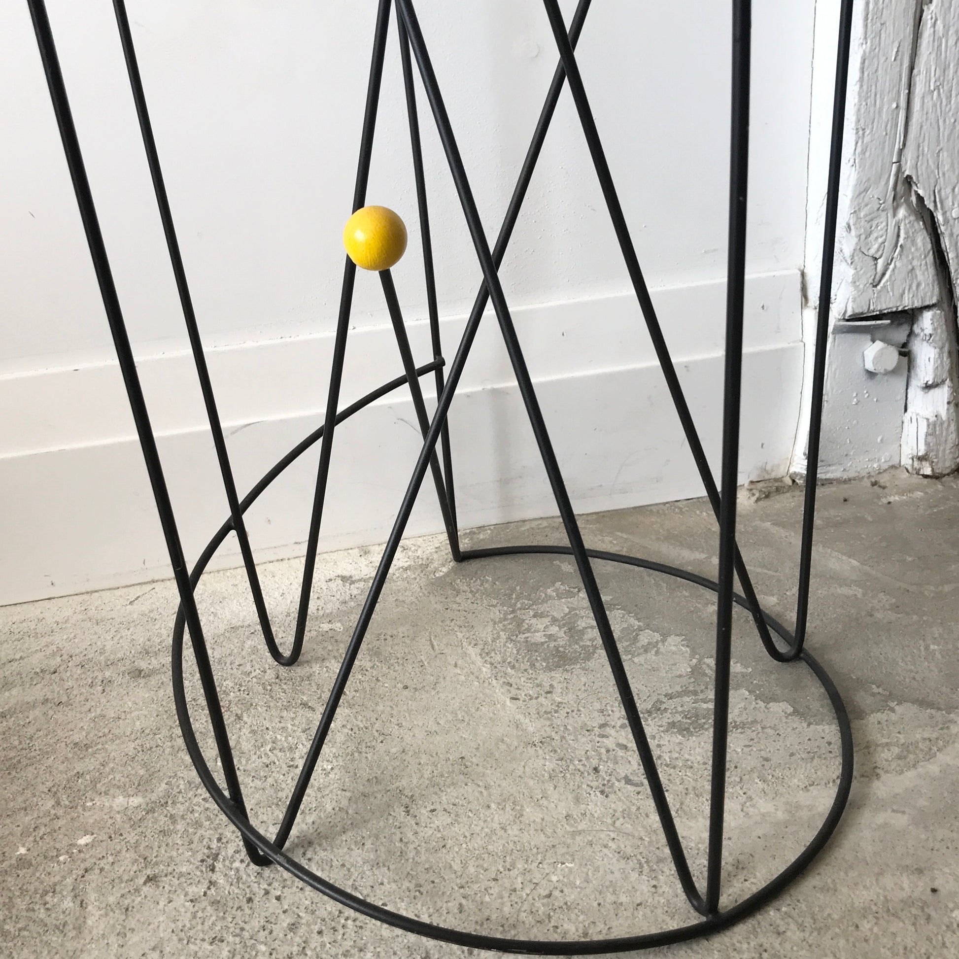 Painted multi-coloured wood with black sculpted metal. Umbrella stand/coat rack/sculpture; this piece has such great energy. 41″ h x 14″ w. France, 1950s.
