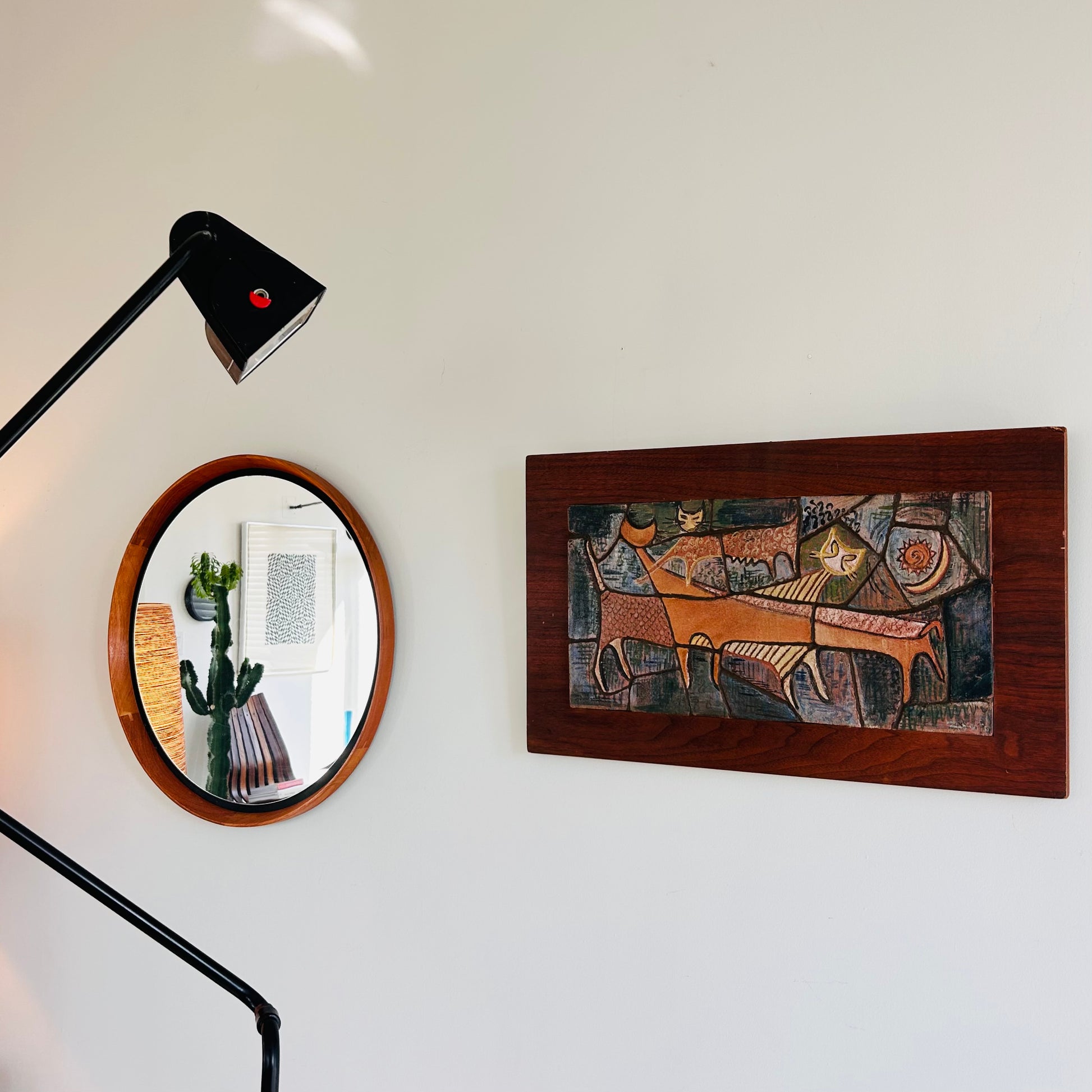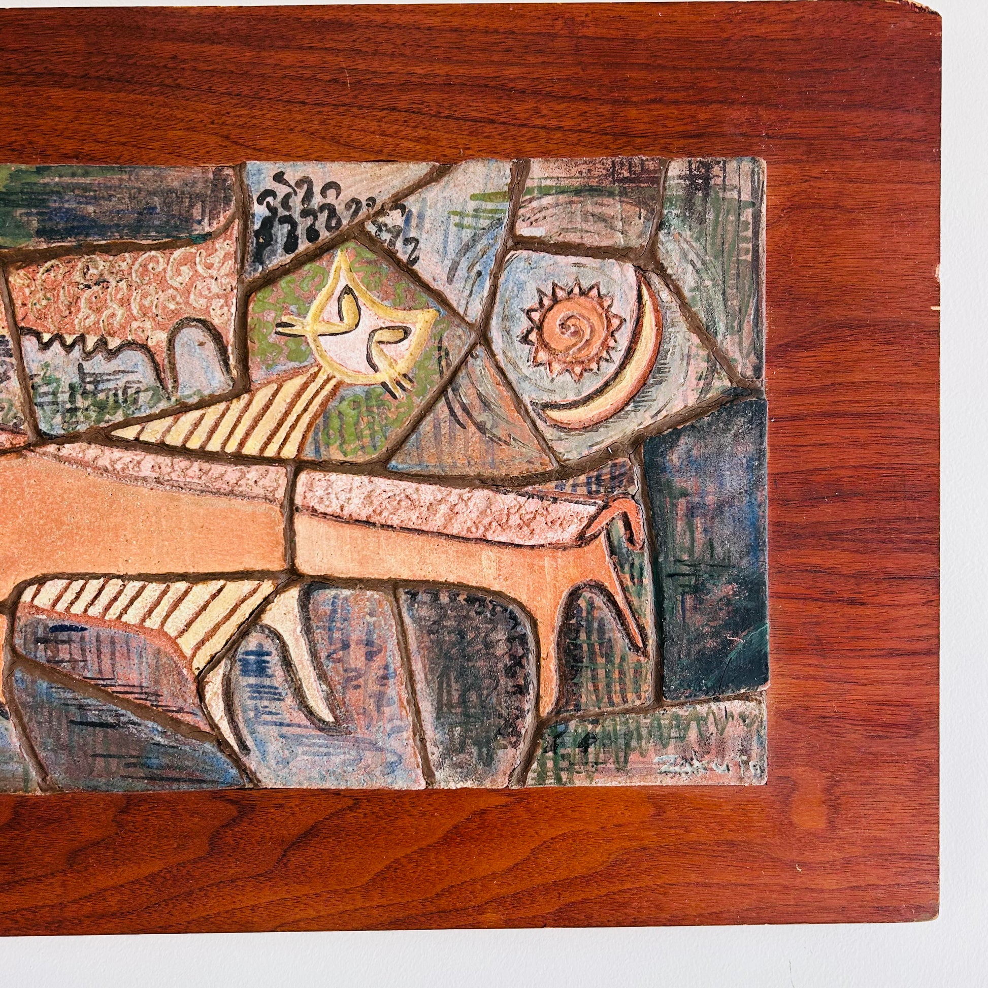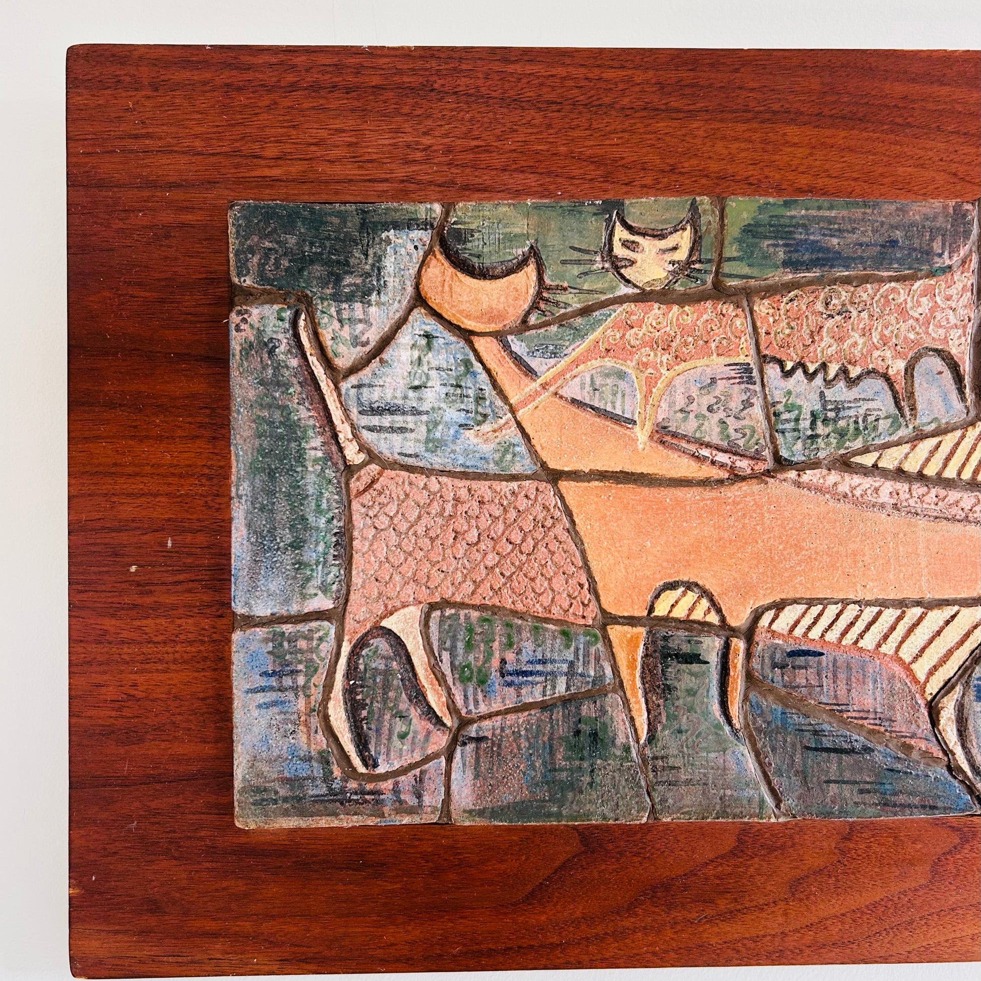 Mounted vintage ceramic relief tile with abstract cats by Anette Zanuta, member of Toronto's Five Potters. 24” x 14” x 1” (outside) 183/4” x 9 1/4” (inside). 1970s, Canada.