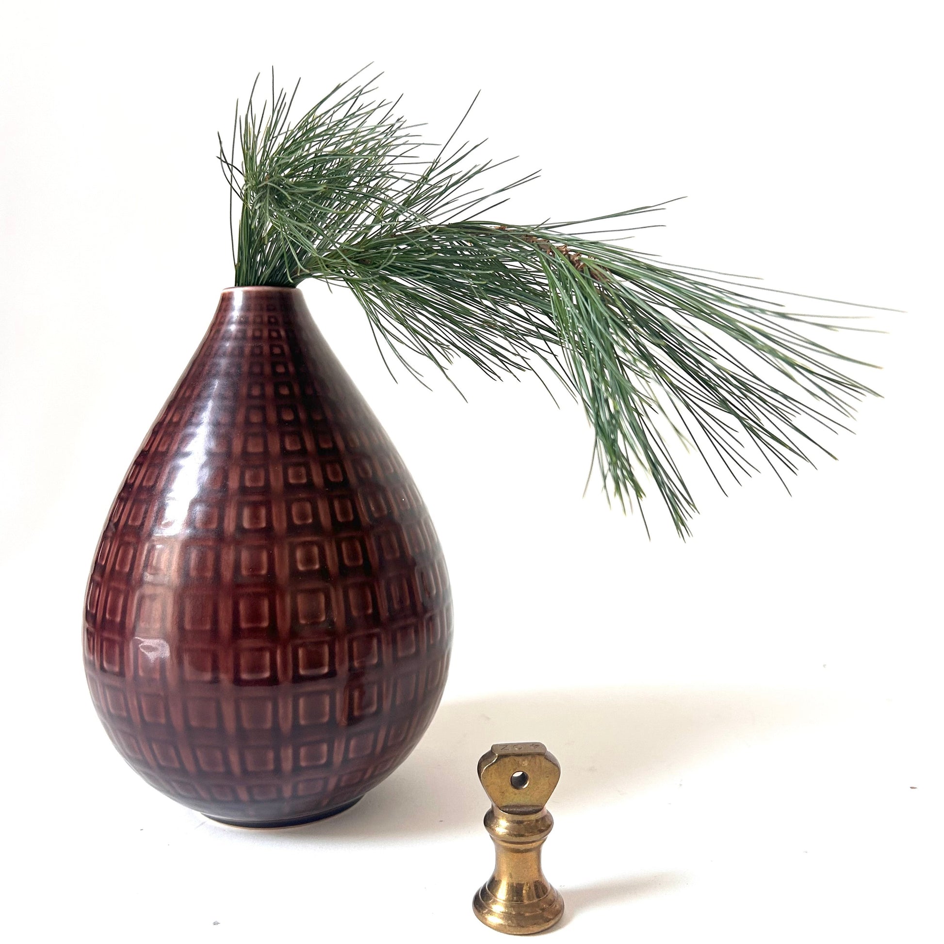 Large ceramic Marselis vase by Nils Thorsson for Royal Copenhagen; manufactured by Aluminia. Warm chestnut brown glaze with a raised descending square grid design. Marked 2631. 8"h x 5" diameter at centre. Denmark, 1950s