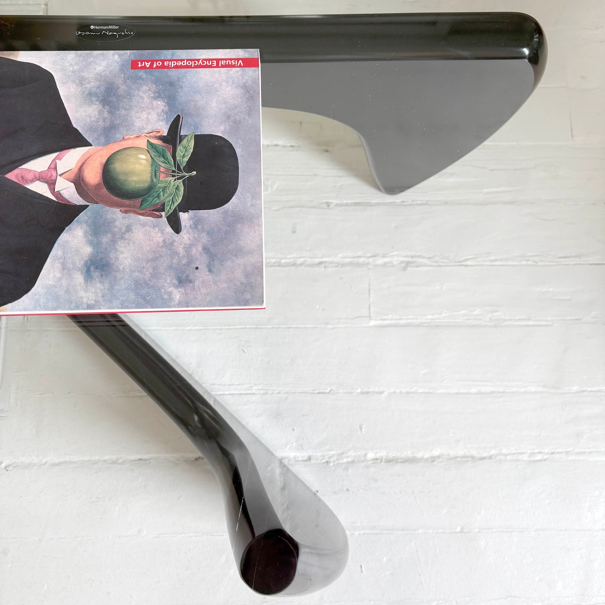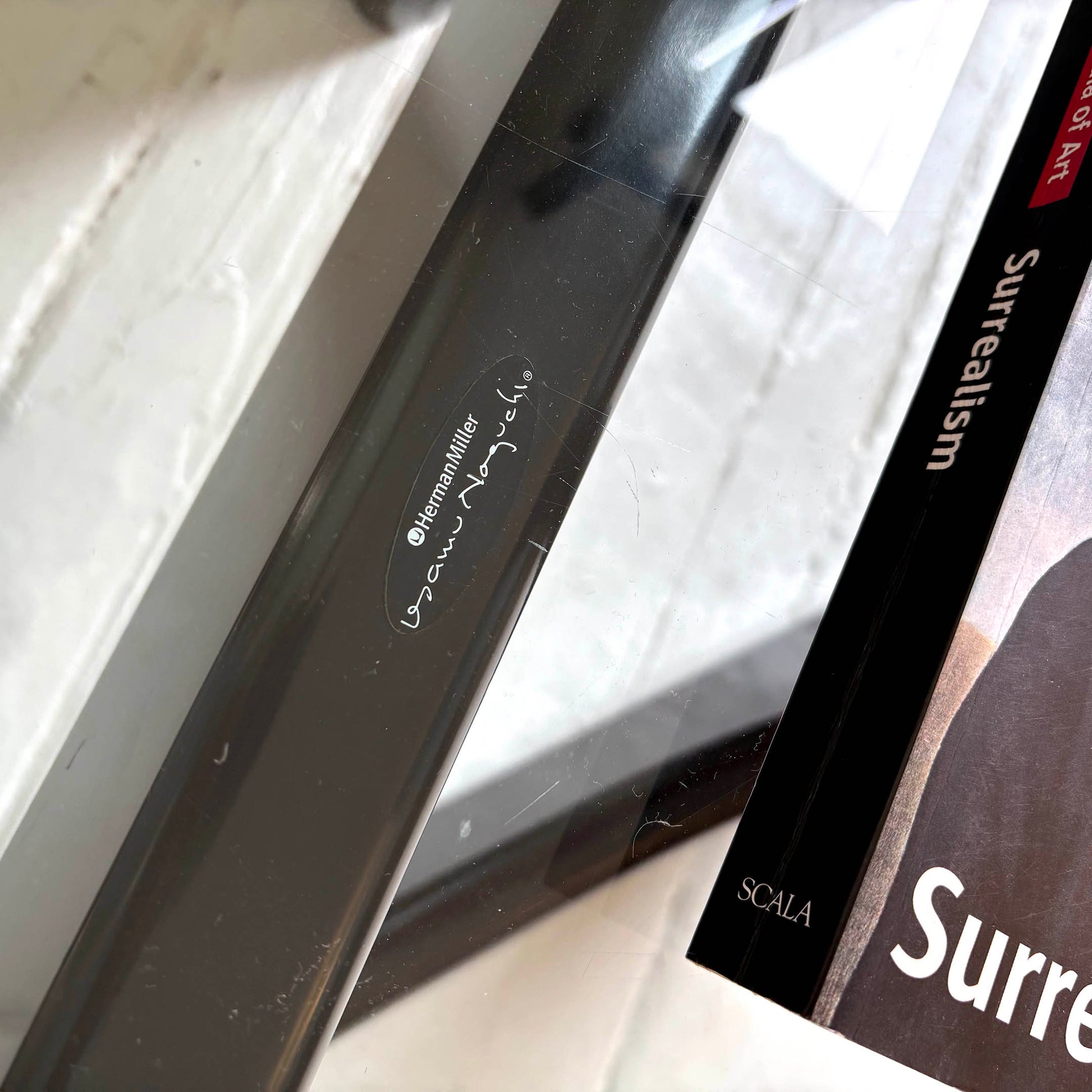 An iconic piece of Mid Century Modern furniture. This freeform glass and black lacquered wood coffee table was designed by Japanese sculptor Isamu Noguchi for Herman Miller in 1944. Known for its sculptural beauty functional balance and playful curves.
