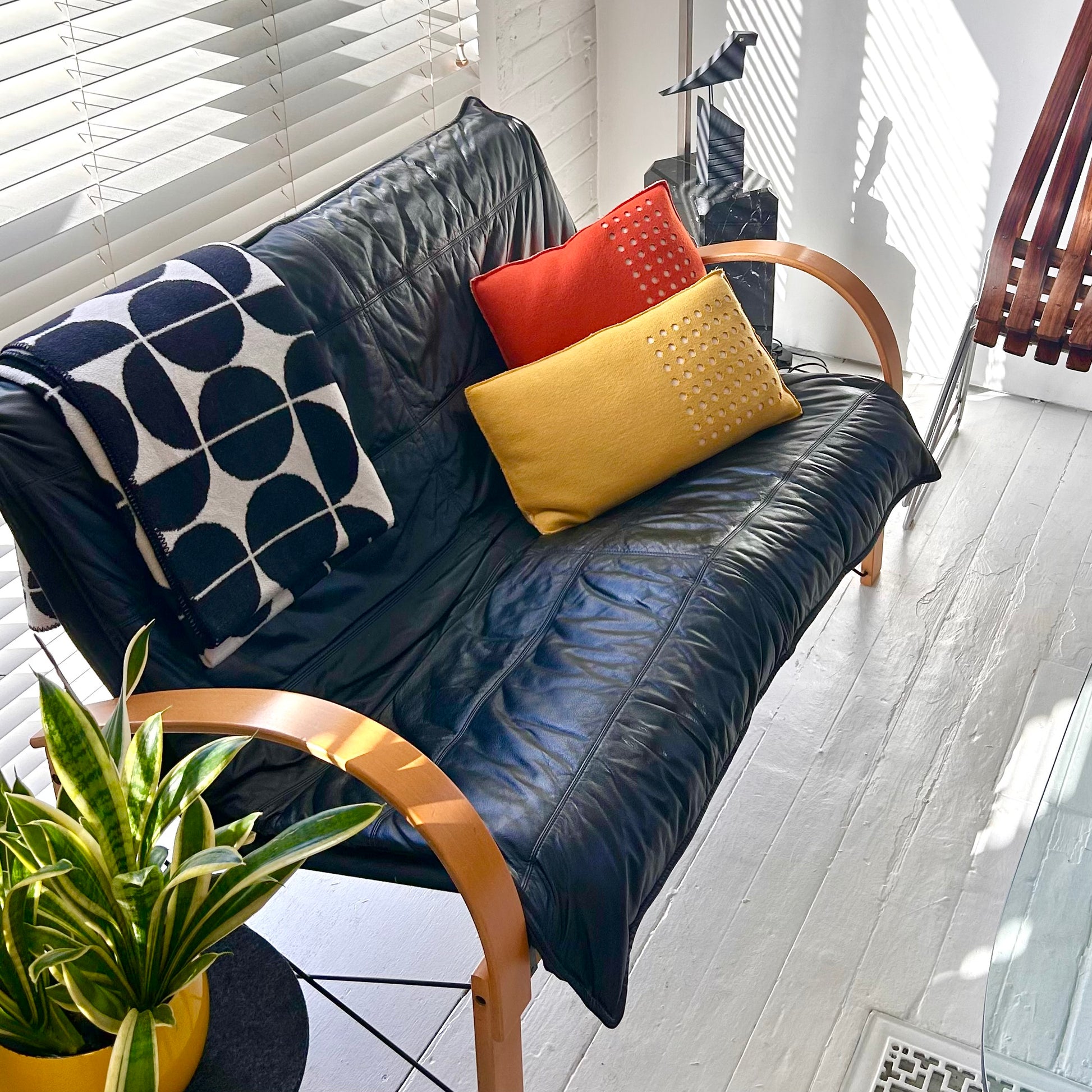 Buttery soft leather on this Tord Bjorklund for Ikea 1980. Beech wood structure and black leather seat. 52.5"w x 31.5"d x 31.5"h. Excellent vintage condition.