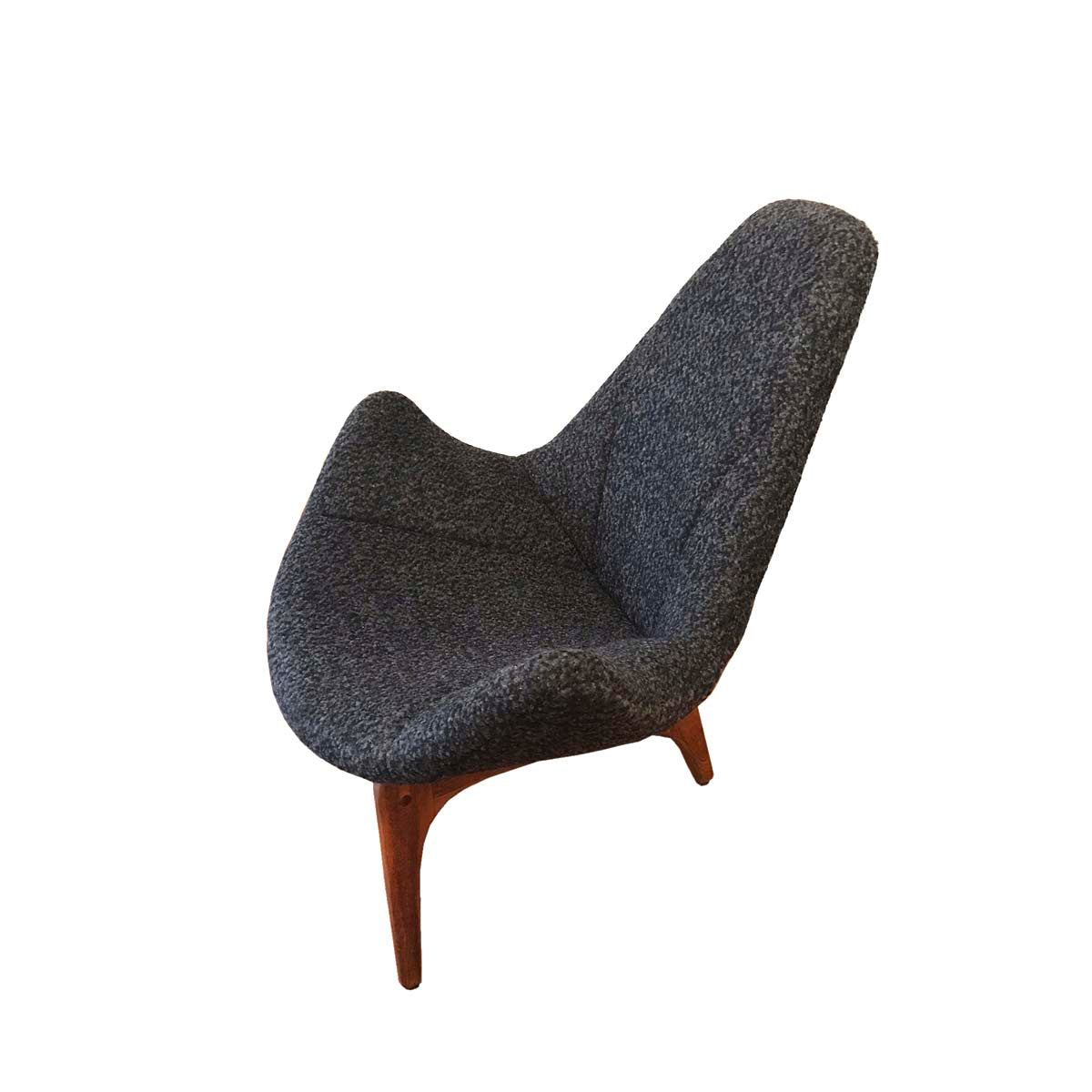 Steel frame, solid teak legs. Fully restored; wool blend, grey and black bouclé. Elegant and cozy! Petite & lovely. Provenance unknown, 1950s/60s.