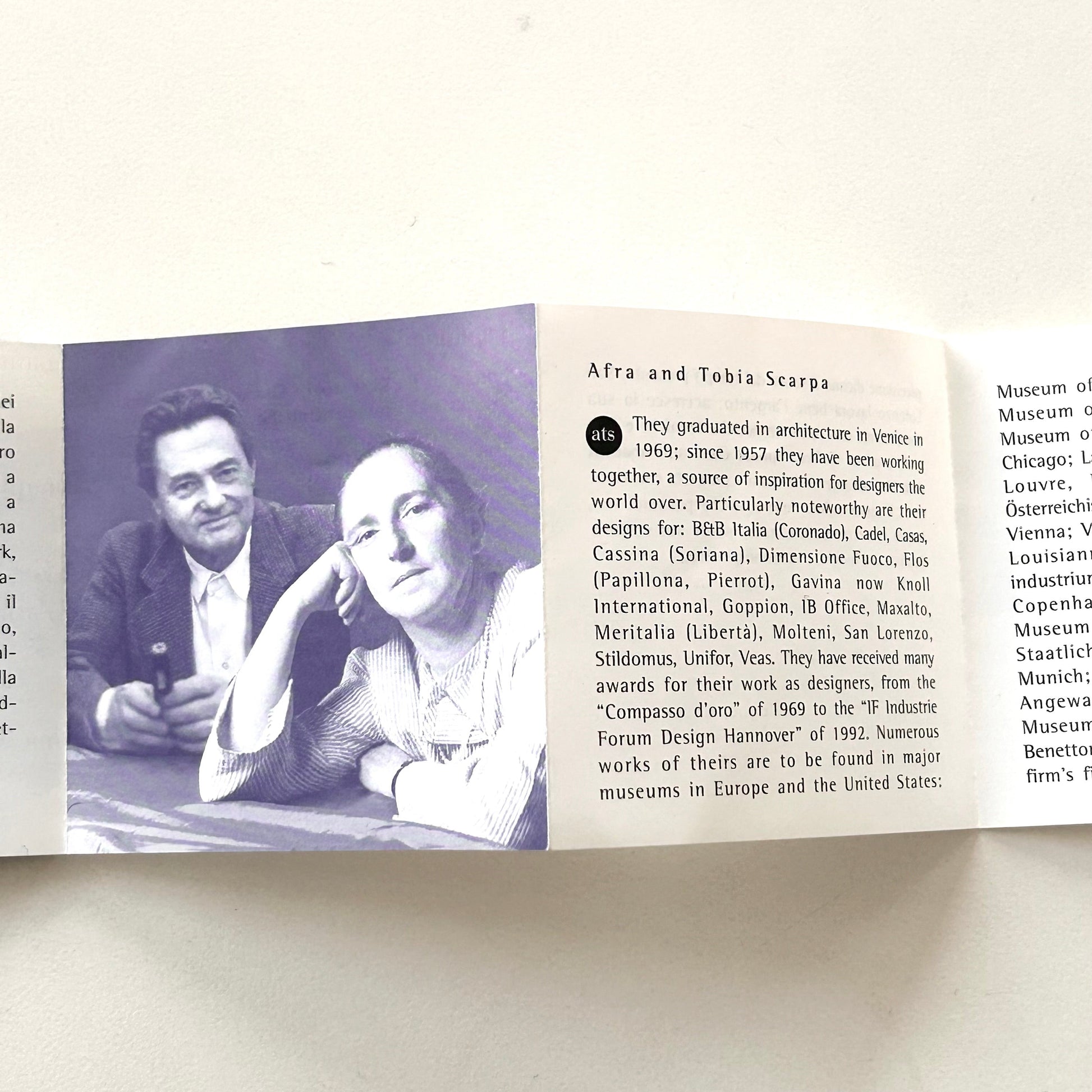 Afra and Tobia Scarpa, award-winning postmodern Italian architects and designers. Their pieces can be found in museums across the United States and Europe, including collections in MoMA and the Louvre Museum.[1]They have collaborated with companies such as B&B Italia, San Lorenzo Silver, and Knoll International. They have won a number of awards such as the Compasso d'Oro in 1969 to the International Forum Design in 1992.[2] Their design work consists of architecture and everyday household items including, furniture, clothing, interior design, art glass. They focused on the technical and aesthetic possibilities of materials in their designs. The couple was greatly influenced by Tobia’s father, Carlo Scarpa, a Venetian architect and designer.