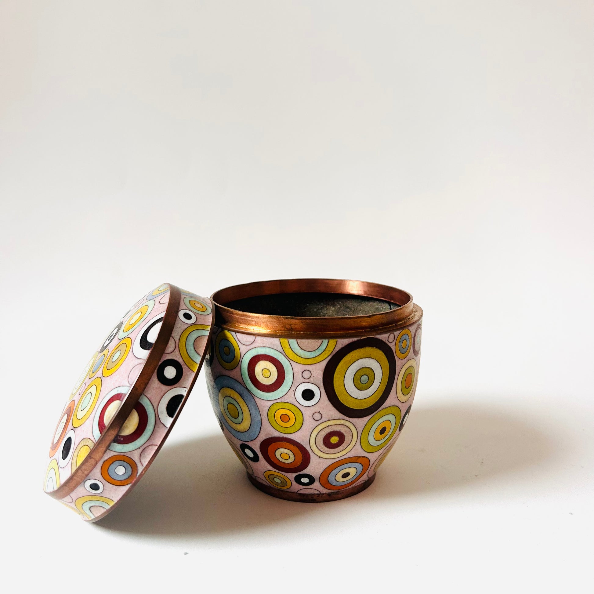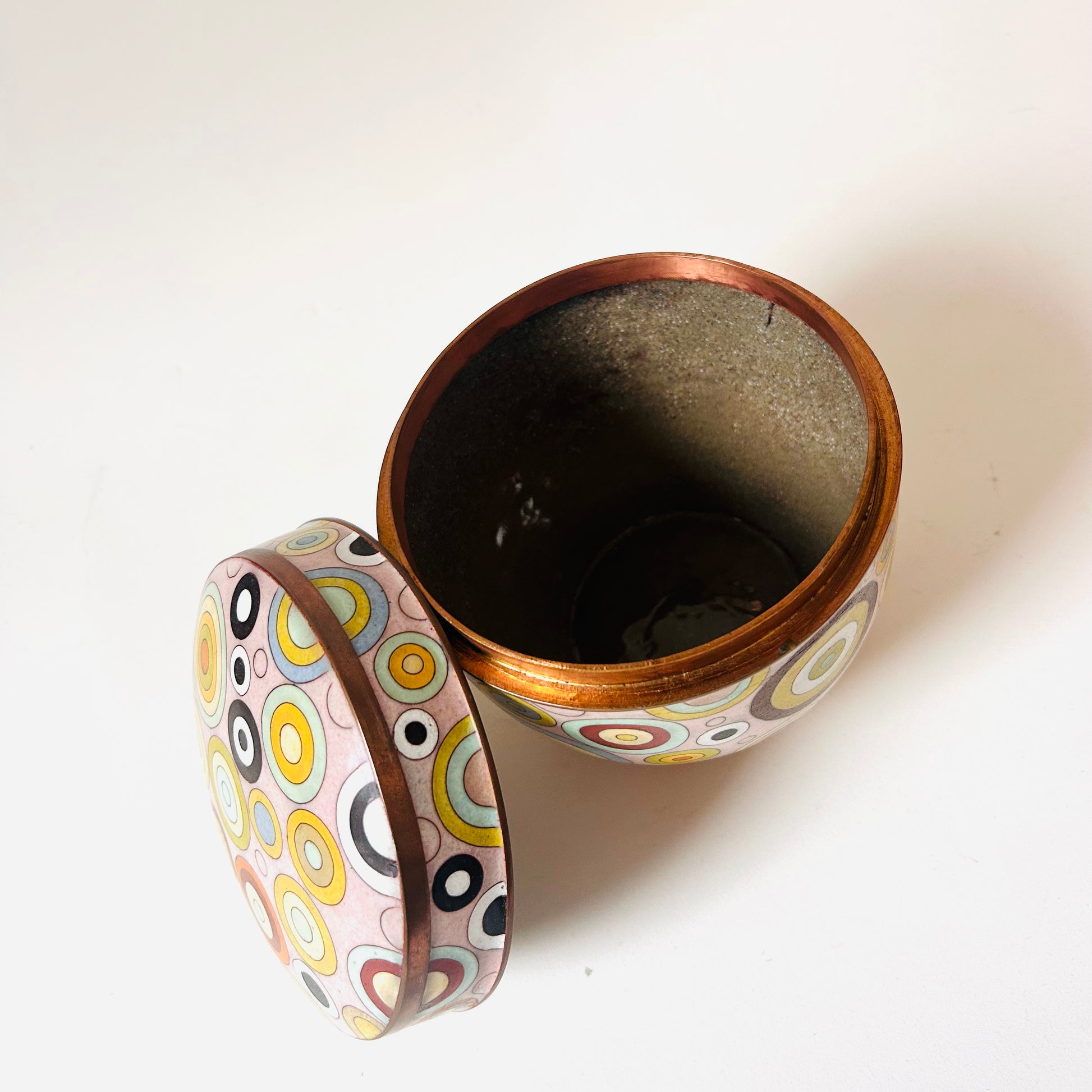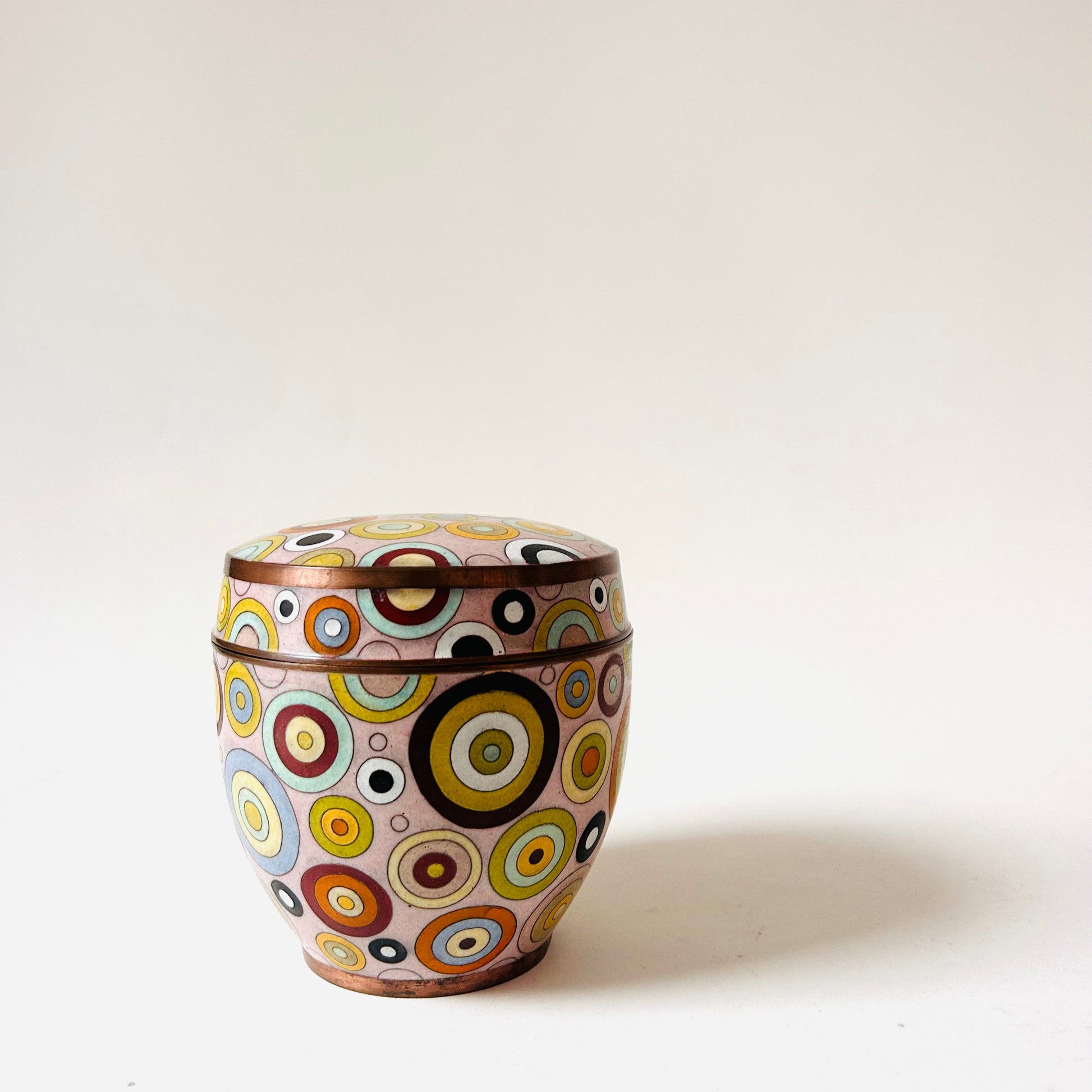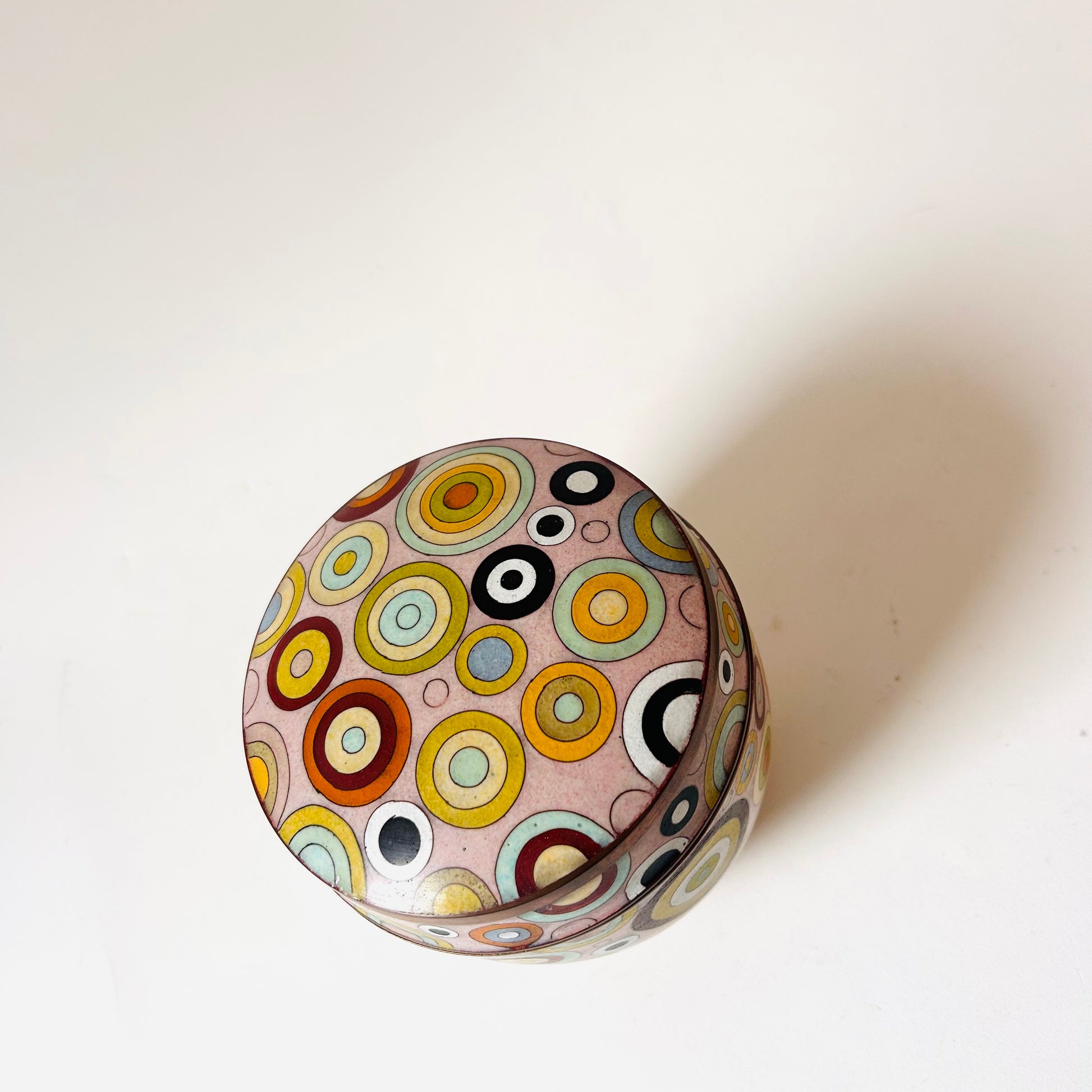 Stunning and rare find. Cloisonné enamelled copper canister with Rondo pattern by Fabienne Jouvin. 5”h x 6”w. Excellent condition.