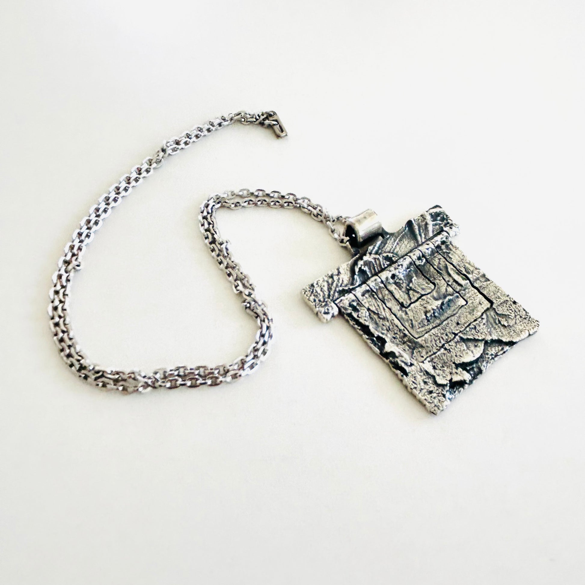 Fabulous articulating brutalist hinged pewter pendant by French Canadian multi-disciplinary artist & designer Guy Vidal. Mint condition. 2.25" x 2.75", 18" chain. Canada, 1960/70s.