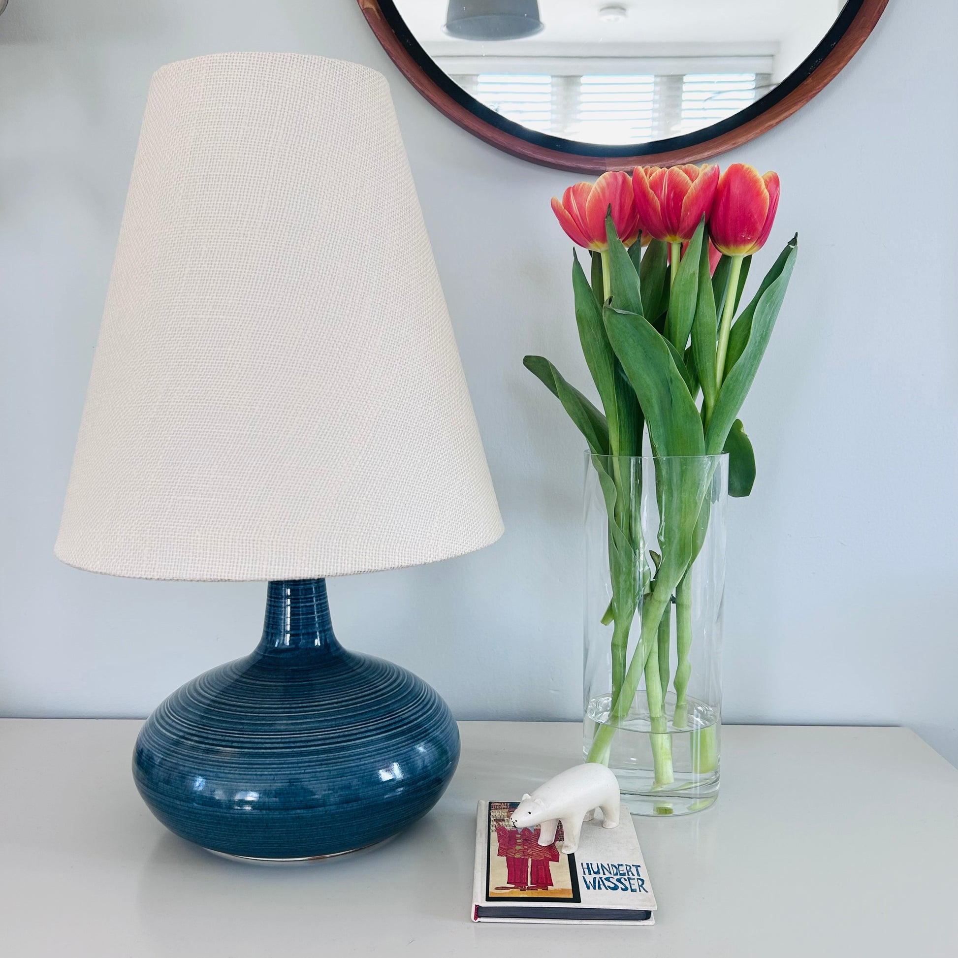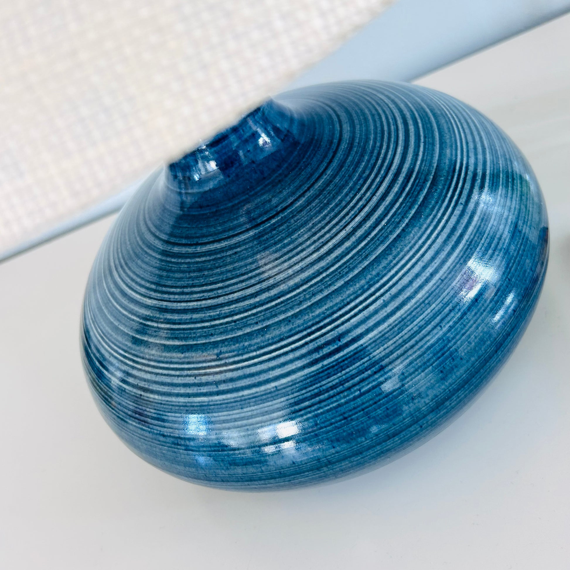 RARE. Beautiful Lotte Lamp Model 1100 in ultra marine with the original finial and our new shade. Beautiful banding in the glazing. 20 3/4” high. Excellent condition. Made in Canada, approximately 1965.